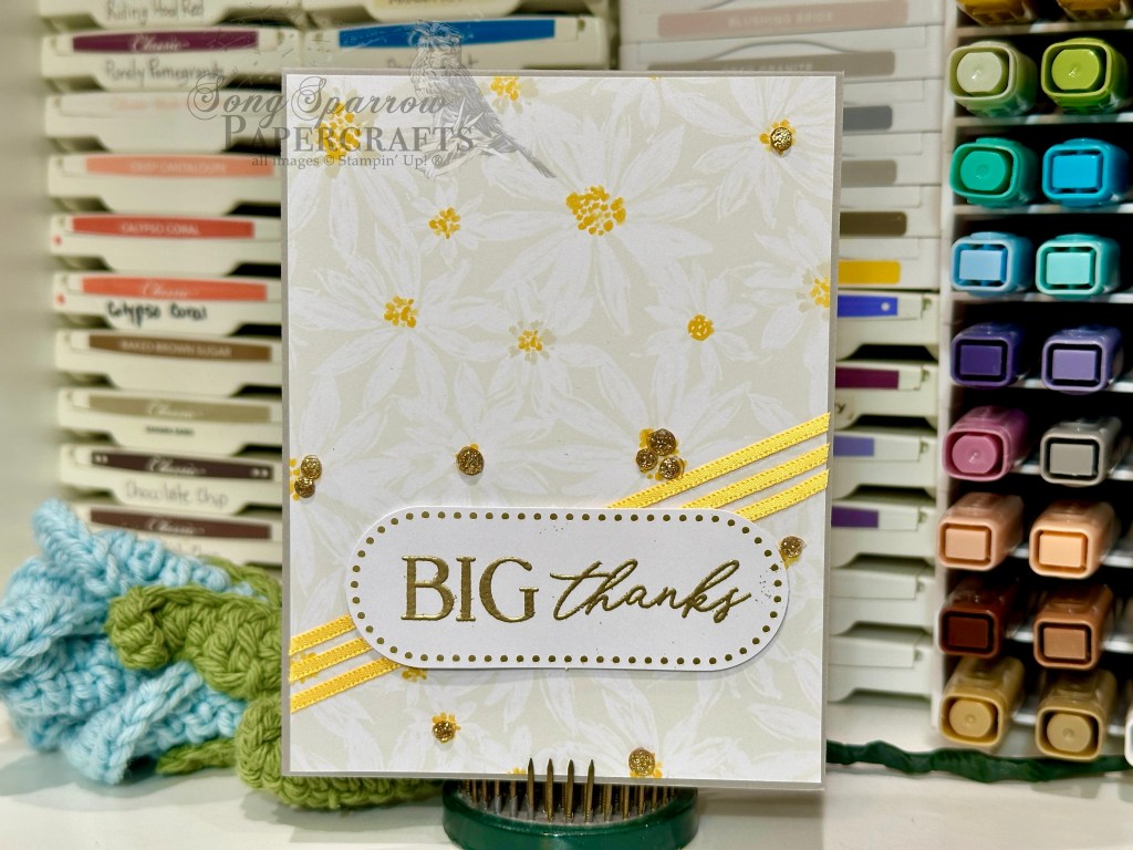 I wanted a nice neutral base that paired well with the subtle background of the patterned sheet and decided that Smoky Slate was the ideal choice for the card base. The sheet of patterned paper serves as the backdrop for our card front. I modified the sketch slightly so that our 3 diagonal elements are solid lines rather than broken and used the narrow Daffodil Delight satin trim for those diagonal elements. The sentiment from the coordinating 12 Days of Crafting Advent Calendar stamp set is heat embossed in gold on the long oval diecut from today’s box of diecut pieces. The sentiment panel is mounted over the ribbon with dimensionals. I used the shaker elements as individual embellishments in several floral centers by adding pieces of glue dots to the backs of each small gold glitter circle.