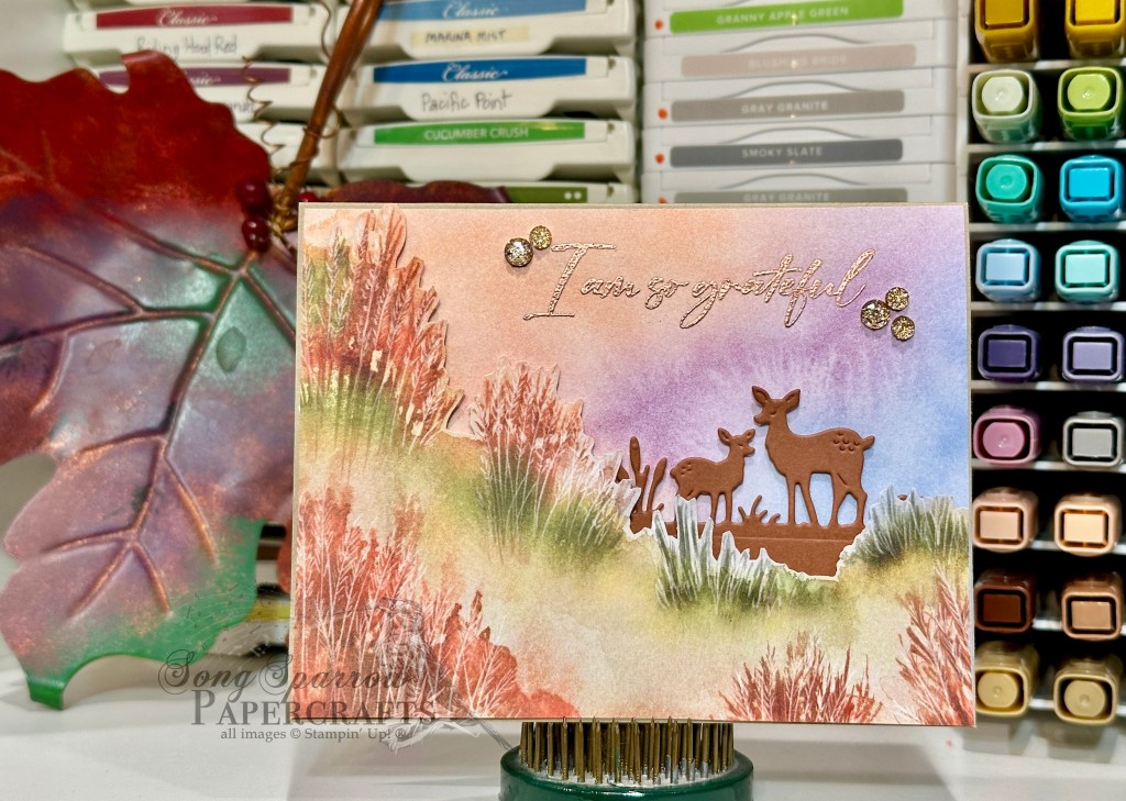 We get started with a base of Crumb Cake cardstock. I left a teensy border of it exposed around the edges of the card to pull out some of the lighter colors in our sheet of Thoughtful Journey patterned paper. This sheet of fall grasses provides the perfect meadow backdrop for our doe and fawn pair from the Autumn Trees die set. The pair of deer are cut from a sheet of Cajun Craze cardstock and tucked behind our grassy panel to give the effect of them standing in an open part of the meadow. To create this look, I used the full 6×6 sheet of Thoughtful Journey and started by cutting around the top set of grasses to allow us to create some depth of field by adhering it over the top portion of the sheet with dimensionals. The sentiment from the Sentimental Framing stamp set is heat embossed in copper at the top of the sheet. A few drusy embellishments flank either side of the sentiment to draw the eye in and provide some sparkle in the sky.