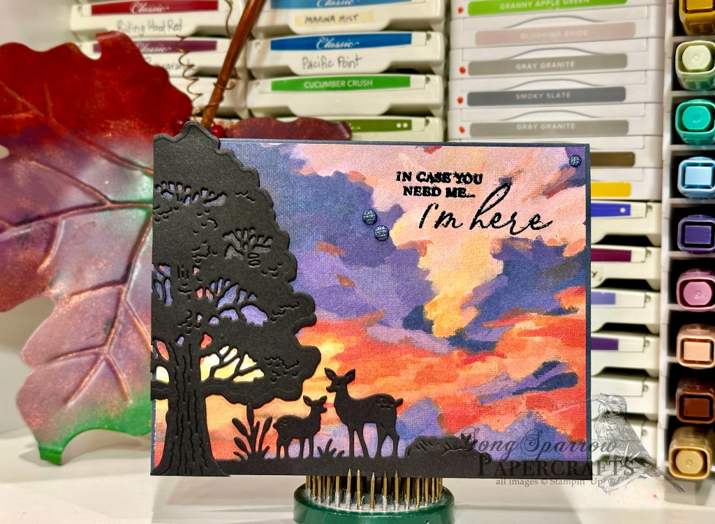 So our design gets started today with a base of Secret Sea cardstock. This is the perfect blend of a blackish-blue that really brings out the moodiness in our beautiful backdrop from the Everyday Skies paper pack. We often see both sunrises and sunsets a lot like this scene, where it’s bright & beautiful and casts the perfect light for silhouettes. And here, our mighty oak and pair of deer are silhouetted by our beautiful sunset on the open prairie. To create this effect, we use the Autumn Trees dies to cut the shapes from black cardstock and then adhere them to our backdrop with dimensionals. I love how this accentuates the shadowing in our scene. The sentiment from the Beautiful Butterflies stamp set is heat embossed in black in top-right corner of our card and we flank the sentiment with some Secret Sea faceted shimmer dots as a finishing touch.