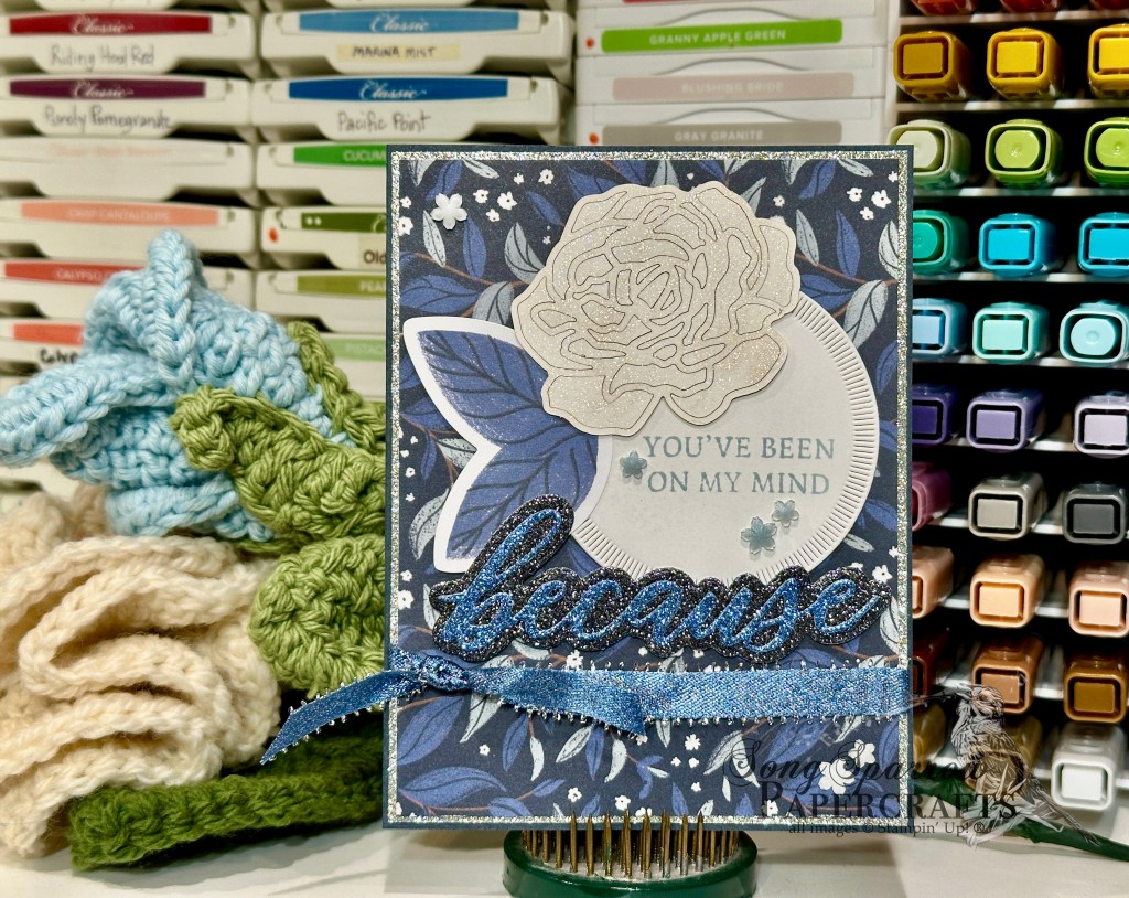 This card comes together super quickly. We get started with a base of Secret Sea cardstock. Our background panel consists of the vine patterned sheet from the Peaceful Garden pack with the silver glimmer paper from the coordinating glimmer pack. Our focal panel consists of the sentiment and an overlapping image. We get started by cutting a circle from white cardstock with the middle size of Spotlight on Nature dies. I stamped a portion of the sentiment in Cloud Burst ink directly on this panel. The rose diecut is from the up-and-coming Covered in Flowers accents pack and overlaps the set of leaves from the Peaceful Garden sticker sheet. I covered the rose with Wink of Stella for some extra shimmer on our focal panel. The remainder of the sentiment is diecut from Secret Sea and Misty Moonlight glimmer paper from the Peaceful Garden glimmer pack using the Words of Beauty dies. This full panel is adhered to our card front on a single layer of dimensionals just above a bow of Misty Moonlight & silver edged ribbon. We finish things off with some Hues of Blue Flowers.