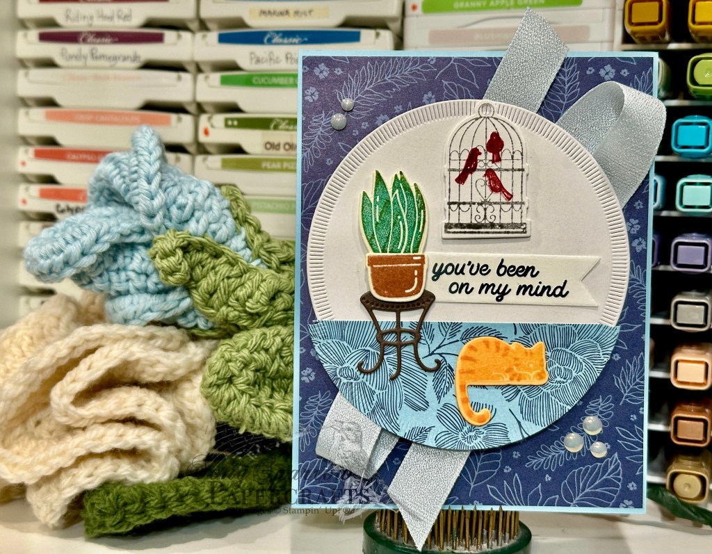 We get started with a base of Balmy Blue cardstock. I chose the leaf frond pattern from the True Blue Florals paper pack to serve as the backdrop for our focal panel. Our focal panel starts with a circle of white cardstock cut with the largest Spotlight on Nature die. I used the large rose pattern from True Blue Florals to break up the white space and serve as an anchor for our scene — specifically to form our area rug. I used the On Display dies to cut all of the scene elements, including the orange tabby cat, the plant and small decorative table, and the cage of red finches. The sentiment is also from the On Display set and is stamped on a banner of white cardstock cut with paper snips. Dimensionals help give layer and depth to our scene. The full panel sits atop a twist of the new Cloud Cover linen ribbon. And we flank our panel with some Cloud Cover flat pearls.