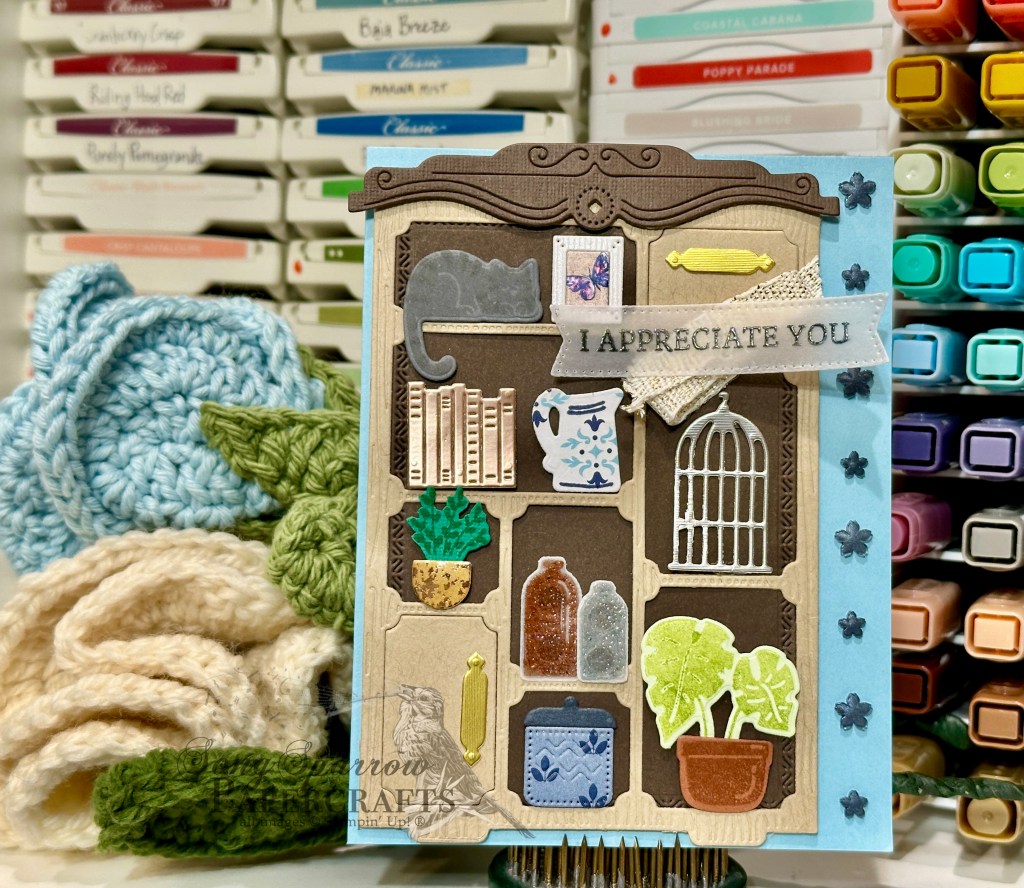 I chose a base of Balmy Blue as the base for this card — mostly because I had intended to use a panel of the True Blue Florals paper as a backdrop and then decided against it. But I did mimic one of the patterns by creating a pattern down the side of the card with the Hues of Blue flowers. The curio cabinet itself is a combination of Crumb Cake and Early Espresso cardstocks. And then I worked to fill the cabinet with a bunch of things that you might find in your grandma’s cabinet. I tried to make all of the little images look realistic and was careful in choosing papers and textures to bring the images to life. To help the sentiment stand out in the scene, I decided to stamp it on vellum and adhere it atop a small twist of the new gold & white woven ribbon (releasing next week).