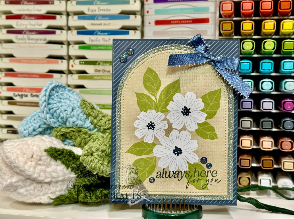 Today, we’re keeping things pretty simple. We get started with a base of Secret Sea cardstock. The background layer is the striped pattern from the Traditions of Christmas paper pack. I cut apart the image sheet in the Lovely Blossoms paper pack and used one of the large images. To make things interesting, I decided to cut it down with the Everyday Arches dies and cut a mat from a sheet of the silver Peaceful Garden glimmer paper with the next-up arch die. The sentiment is from the new (coordinating) Lovely Arrangements stamp set and is stamped in Secret Sea right on top of the focal image panel. The whole panel, including mat, is adhered to the card front with dimensionals. And we finish everything off with a bow of Misty Moonlight & Silver ribbon and some of the new Misty Moonlight sparkle dots.