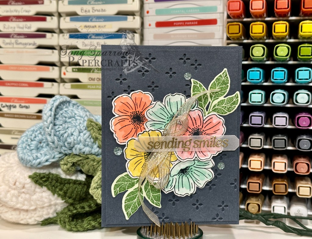 Today’s card is actually pretty simple and comes together relatively easily. We get started with a base of Secret Sea cardstock. I used a quarter panel as the backdrop and punched it up by die cutting the eyelet pattern on the diagonal across it using the Lovely Arrangements die. The panel is then adhered to the card front with dimensionals to really give that eyelet pattern more prominence. Our focal section is the florals. I stamped a collection of both the large and small flowers from the Lovely Arrangements stamp set in Secret Sea on white paper and cut with the coordinating dies. The images are filled in with an assortment of Stampin’ Blends, using the darks from each pair for the centers and the lighter blends for the flower petals and edges. Nothing too precise — just swipes across the images. I really love this simple shading method and the look you get. I also stamped a couple of the leaf bunches in Garden Green on Soft Sea Foam paper and cut them with the coordinating die. And then we start arranging the flowers and leaves to get the layers of color and shapes that are most pleasing to the eye before sticking everything down. Glue dots adhere the elements that are in the background, while varying layers of dimensionals give us the depth and layers in the flowers. The sentiment sits on a banner of vellum cut with the Words of Beauty die. The sentiment from the Lovely Arrangements stamp set is stamped in Versamark on vellum and then heat embossed with gold and is adhered over a twist of the gold striped mesh ribbon with glue dots. A few traditional sparkling sequins finish things off with a pop of Pool Party.