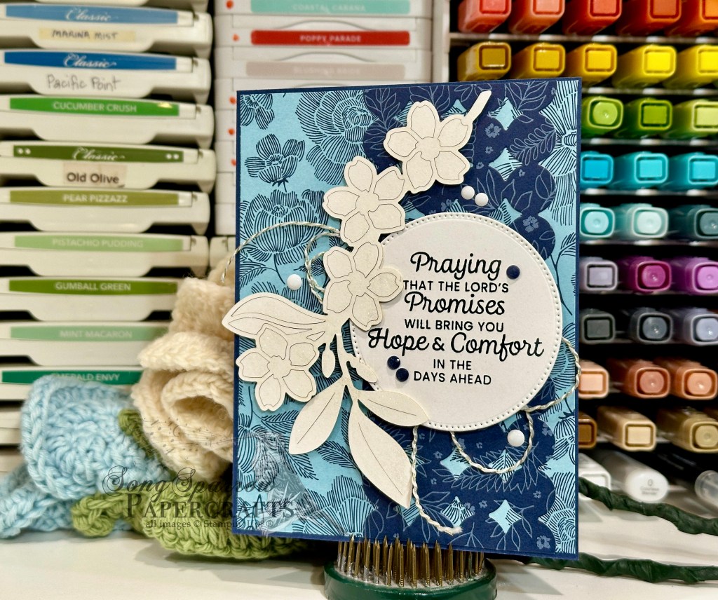 This week, we’re using the new Prayers & Promises sentiment stamp set to create our card designs. I’ve been pairing up this stamp set with a whole host of products in the stash — most of them new goodies. And today we’re using the January Product of the Month True Blue Florals paper, the new Lovely Arrangements dies, and the new laser cut Covered In Flowers accents. (FYI — the January POTM is still available with any qualifying order while supplies last!)