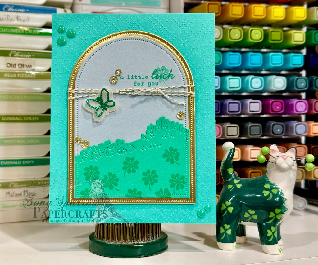 This week’s lucky design theme has been a little harder to bring to life than I expected. I kept reaching for all the same things. But I wanted to bring fresh ideas each day — hence the mojo problem. Today we’re frolicking in the clover as we pair up the Sweet Jar stamps with the Everyday Arches dies to create this window scene.