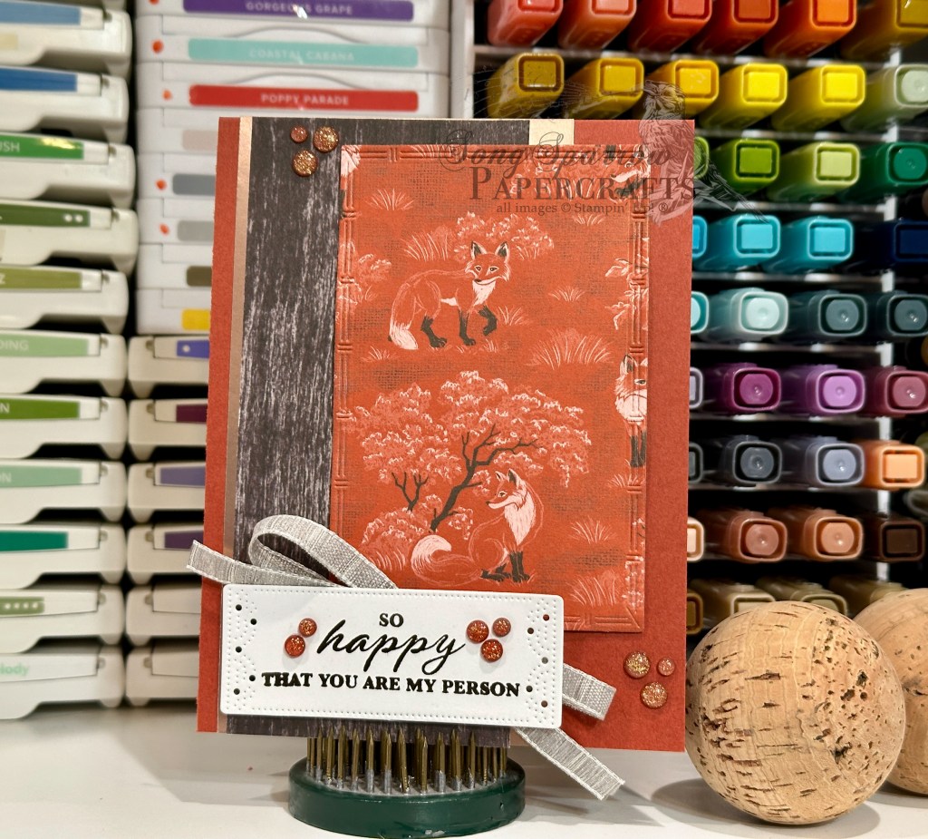 This week, we’re on to a new design series that is all about the critters. And we’re getting started with a few of my favorite critters from the crafty stash — foxes! We’re putting the Autumn Toile paper front & center in this super simple layout that also pairs the Country Woods & Unbounded Love stamps.