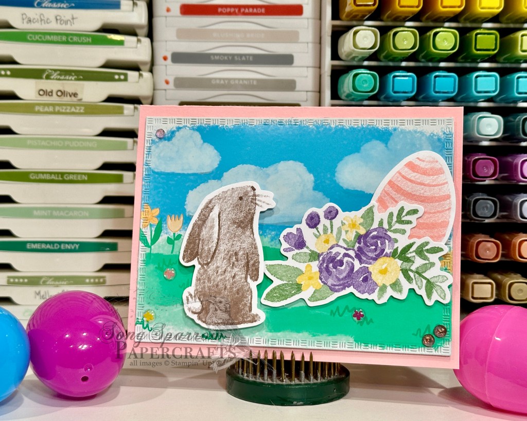 We get started with a base of Pretty in Pink cardstock. Our focal panel starts with one of the ready-made scenes from the Easter Joy paper pack that has been cut down to size using the Textured Notes dies and adhered to our card front panel with dimensionals. We build our bunny hunting eggs scene using the Easter Time ephemera pack — a combination of bunny, flowers, and decorated egg. These are all adhered to the scene with dimensionals to give depth and interest to the scene. We finish things off with some Garden epoxy dots, which are NEW and will be releasing next week, and some of the pink foiled gems.