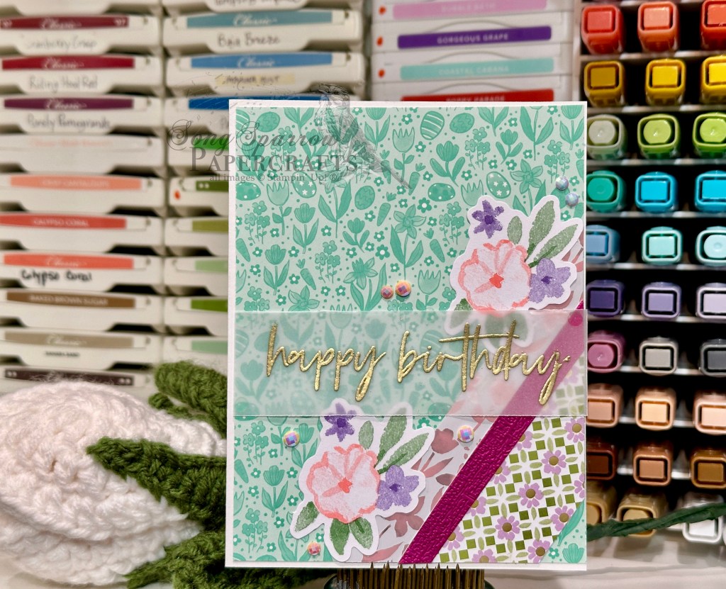 We get started on today’s card with a base of white cardstock. Since we’re using a lot of pattern, we want a nice neutral backdrop. A sheet of the Easter Joy pattern paper serves as our background. For the three diagonal corner strips, we combine the floral foil from the Pleasant Patterns pack, the pink sheet from Garden Textures, and the small floral foiled sheet from the Lovely & Beautiful pack. The two competing floral patterns are broken up with the solid textured sheet from Garden Textures. I wanted all of our fun patterns to show through, so the sentiment from the Fabulous Sayings set is stamped on vellum in Versamark and then heat embossed in gold. Before adhering our sentiment, we add a few floral bunches on either side from the Easter Time ephemera pack and then adhere the sentiment over them with glue dots. We finish things off with some pearlized faceted circles.