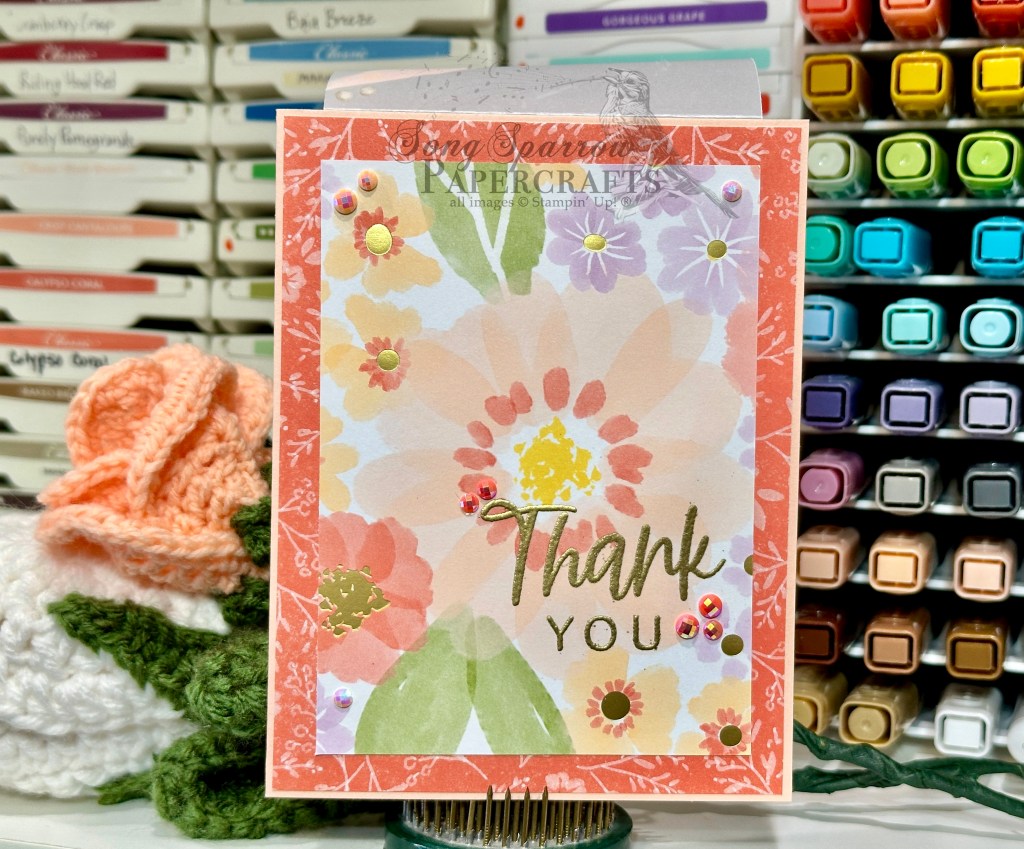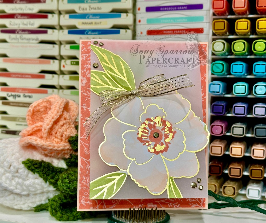 Our beautiful patterned paper is driving the bus on our color scheme today. We get started with a card base of Petal Pink cardstock. Our background is a sheet of the Calypso Coral floral pattern from the Lovely & Beautiful pack. Our front overlay panel is a sheet of vellum that folds over our card front and covers the sentiment panel and has one oversized flower in the center. When the see-through panel is closed, it nicely compliments the smaller foiled floral pattern underneath. We add some metallic gems and gold striped ribbon to this front-facing panel.