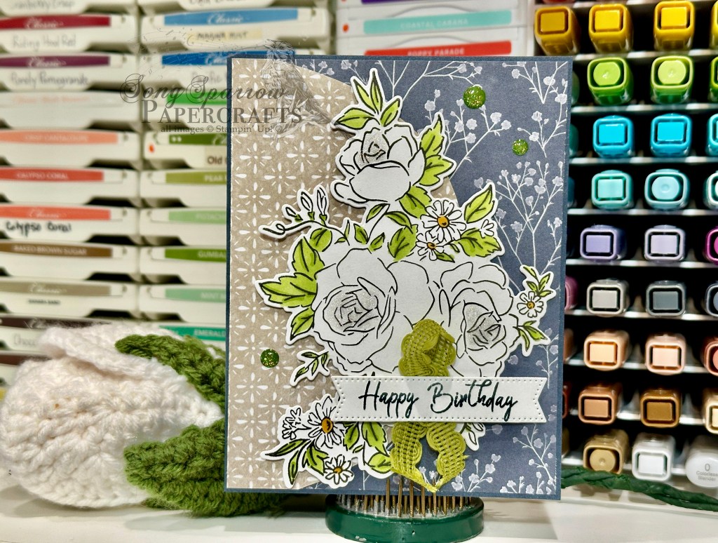 We get started on our card with a base of Secret Sea cardstock. I chose a more neutral pattern from the Peaceful Garden pack and then a sheet that would compliment my chosen focal image. I placed the busier Secret Sea floral pattern on the bottom and then have the neutral Crumb Cake pattern as the half circle on top. The Layers of Beauty image is stamped in black on white cardstock and then the leaves and daisy centers are colored with Stampin’ Blends. The centers of the roses have a touch of Wink of Stella for a little twinkle. Our focal image is adhered onto the card front with dimensionals. The sentiment from the new Rolling Waves set is stamped in Secret Sea on a white banner that has been cut with one of the smaller banner dies from the Stylish Shapes set. The sentiment is mounted over some Old Olive rickrack with several layers of dimensionals. We finish things off with a few Old Olive sparkle dots.