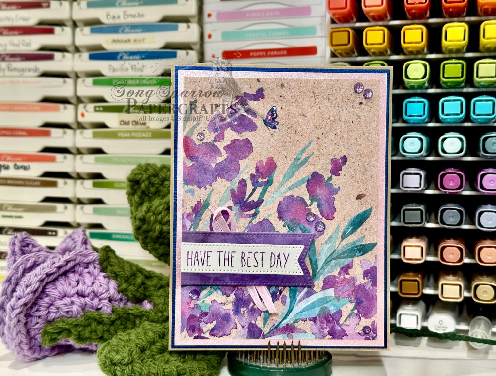 We get started with a neutral base of Crumb Cake cardstock. Our focal panel from the Perennial Lavender pack is double matted with a combination of garden textures foil paper and shimmer paper. The combination of the dark blue and light pink really bring out the darks and lights of the floral pattern sheet. The banner is cut from a purple sheet from the pack using the Stylish Shapes banner die, which serves as the perfect backdrop for the sentiment. The sentiment from the Cutest Crew stamp set is stamped in Gorgeous Grape on a white banner cut with the smaller banner die from the same set. The two banners are adhered together to form one panel and are then adhered over the pink ribbon with dimensionals. We finish everything off with a scattering of purple shimmer gems.