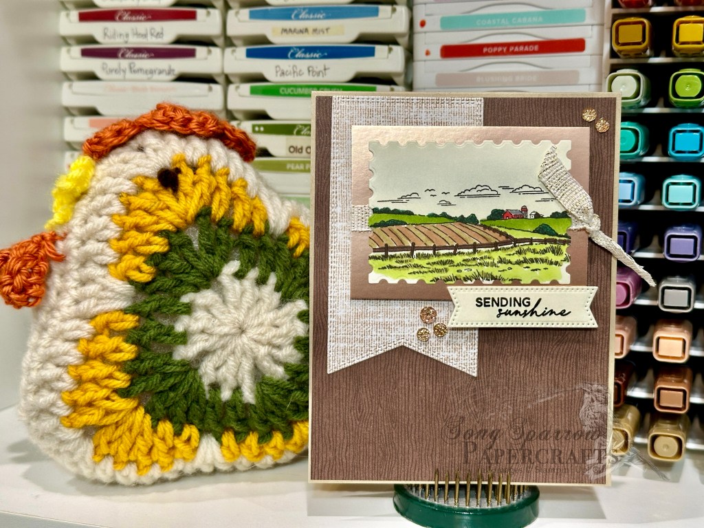 We get started with a base of Crumb Cake cardstock. A sheet of the Woodgrain Wonders paper serves as the backdrop for our design. The focal panel is stamped with the farm scene from the Far & Away Landscapes stamp set, colored with an assortment of Stampin Blends, and then cut out with the Perennial Postage diecuts. To bring a touch of metallic flash and really help our scene pop, we mount the panel with dimensionals on earthen metallic paper over some white & gold ribbon. We mount the focal panel over a banner of Delicate Dreams cut with the Everyday Essentials dies. The sentiment from the Gliding Swing stamp set is stamped in Early Espresso on Very Vanilla cardstock and then cut into a banner using the Stylish Shapes dies and adhered over the bottom edge of the focal panel with dimensionals so it stands taller. We add a dash of twinkle with some drusy embellishments.