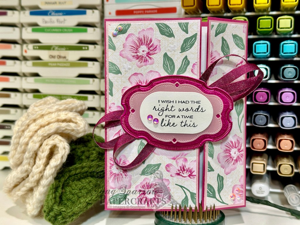 We’re slowly but surely going to work our way through a patterns & textures design series. And today I’m sharing a sneak peek of some new paper that literally has texture — velvet, to be precise. The new Velvet Meadow patterned (and textured) paper is taking center stage in this fun fold sympathy card, along with a few other new products.