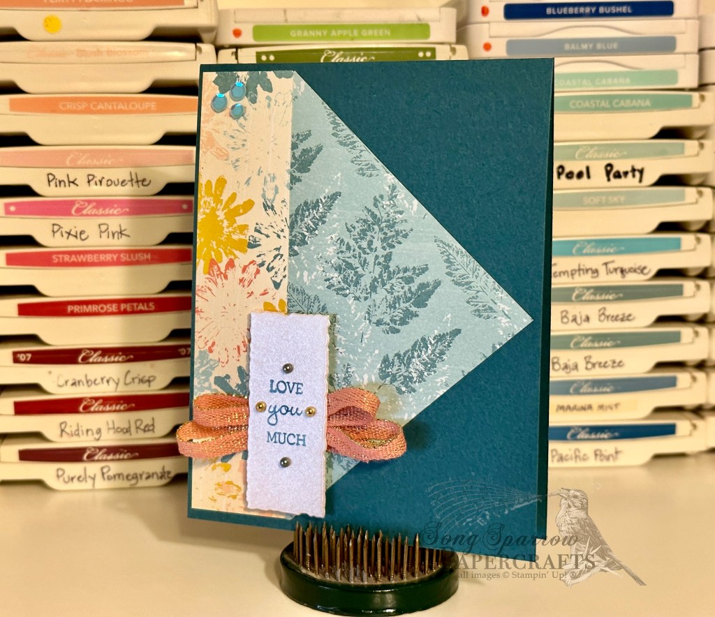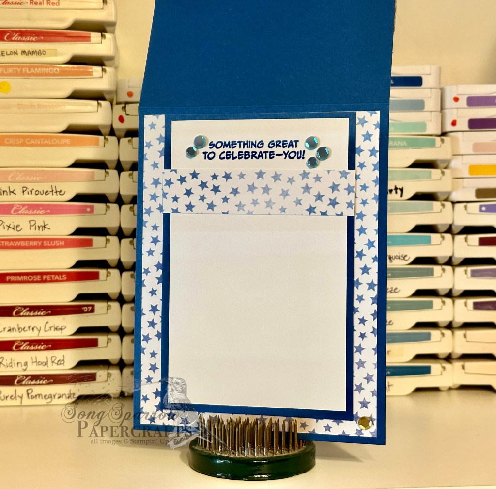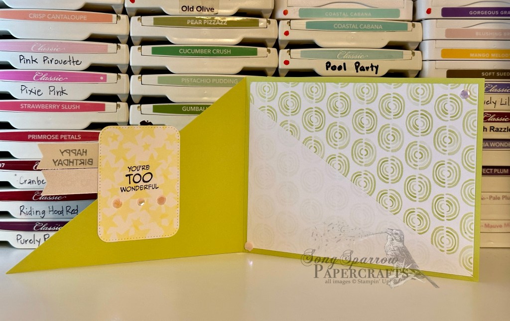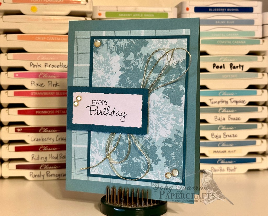This showcases yet another sampling of the SU! Hello, Irresistible designer paper. One of the things I really loved about this design was the ability to use every scrap of the gorgeous paper on both the inside and outside panels of the card. And who says a masculine card can’t have a little sparkle? This design is punched up with a few eye-catching features — silver pearls, iridescent sequins, and the touch of Wink of Stella around the edges of the sentiment elements.