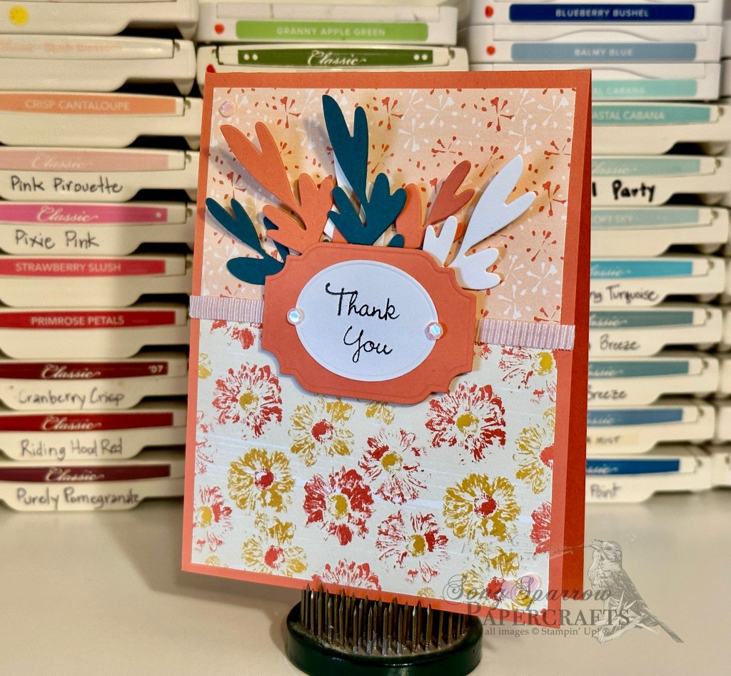 I really have a hard time working with shades of orange. Believe it or not, this card base is a shade of coral, and this card came together easily. Hello Irresistible has really been a delight to work with for that very reason.