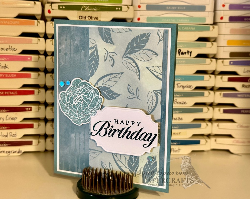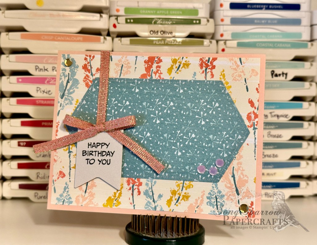Today’s card design is the fourth in the Irresistible Birthday card pack series. This designer series paper has been so fun to work with because it lends itself to so many possibilities. And this card leans much more feminine in both palette and overall feel.