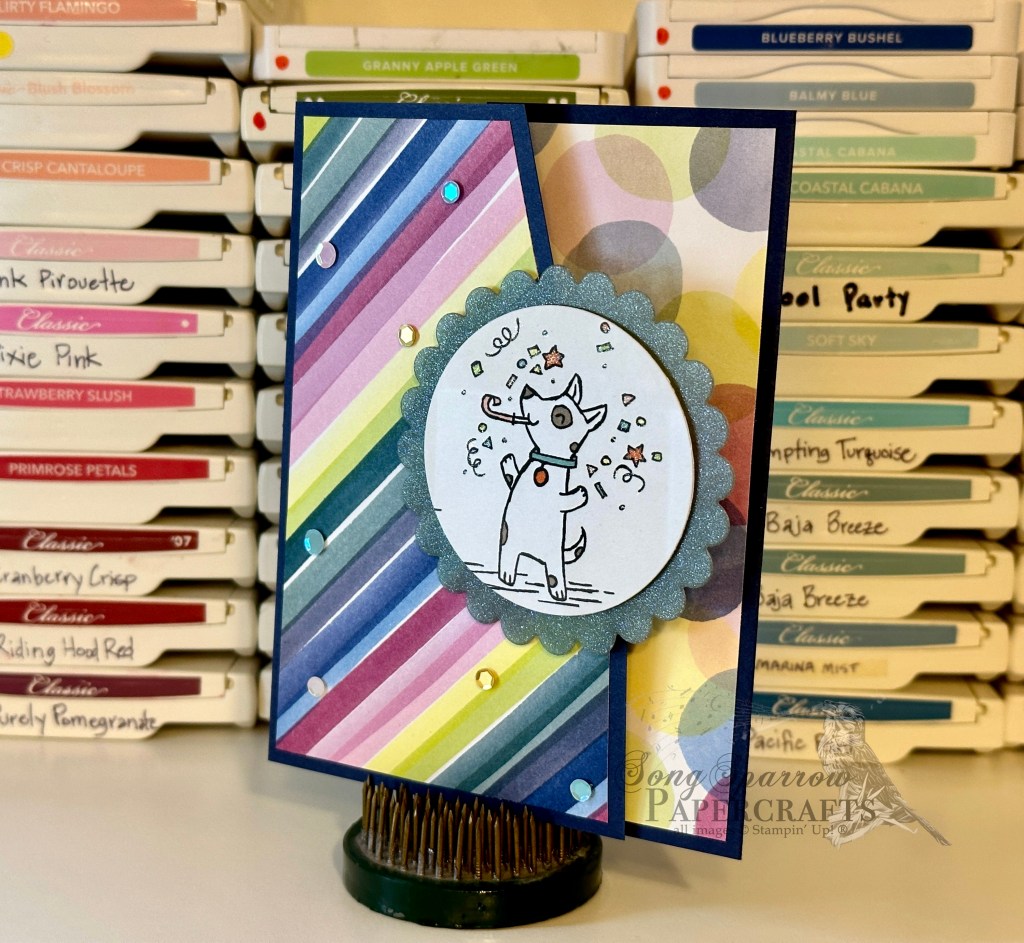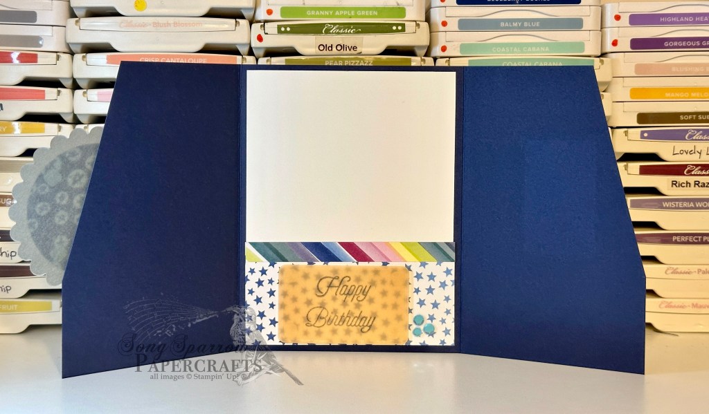 Birthday Confetti angled gate fold: Night of Navy, Basic White cardstock Bright & Beautiful, Zoo Crew DSP Shimmer vellum (retired) Special Moments stamps (retired) Scallop punch Adhesive-backed sequins Wink of Stella Dimensionals Adhesives