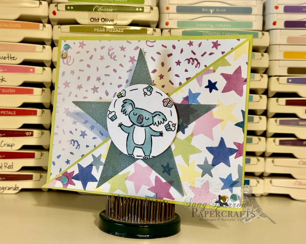 I focused on the SU! Bright and Beautiful and Zoo Crew designer series paper packs in designing this set. As I was sketching out design ideas, it seemed natural to focus on a birthday theme. The bright colors and fun patterns just lent themselves easily to it. And to me, birthday designs call for fun folds! Let’s take a closer look at each card.