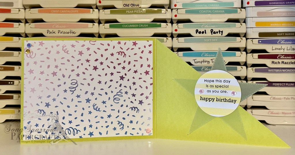 Today we’re taking a look at the third design in the new birthday pack called Irresistible Birthday that will be up in the Etsy shoppe later this week. This design is based on a new fun fold I learned from Sharon Armstrong. The original design has been adapted to exclude a few layers in order to lighten up the design, but it does not lose any of the drama of this unique fun fold.