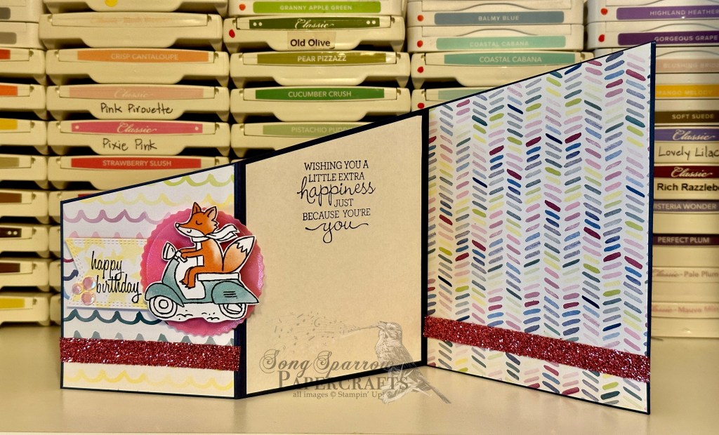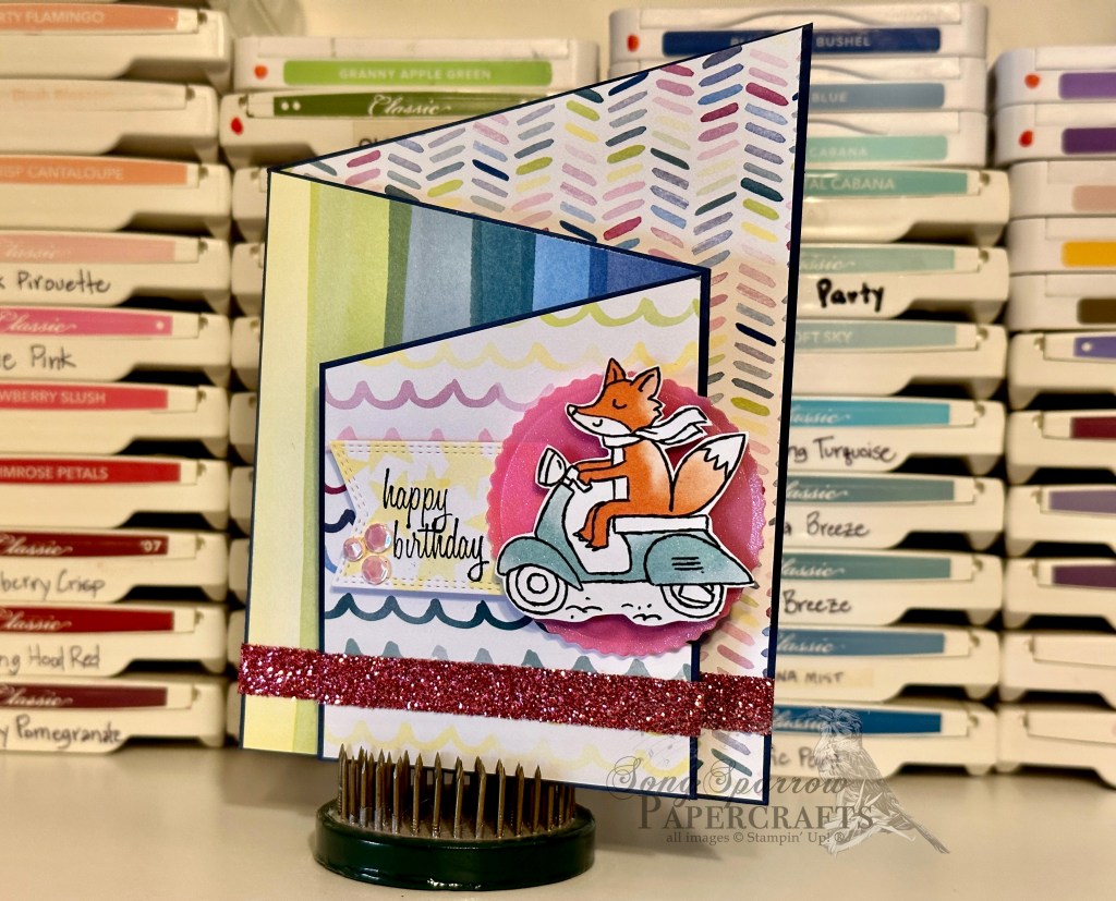 Birthday Fox angled trifold: Night of Navy, Basic White cardstock Bright & Beautiful, Zoo Crew DSP Shimmer vellum (retired) Wink of Stella Pansy Patch stamps All That, Nested Essentials dies Adhesive-backed sequins Dimensionals Adhesives