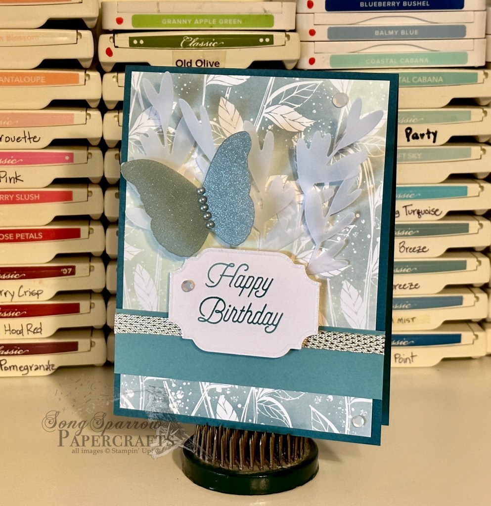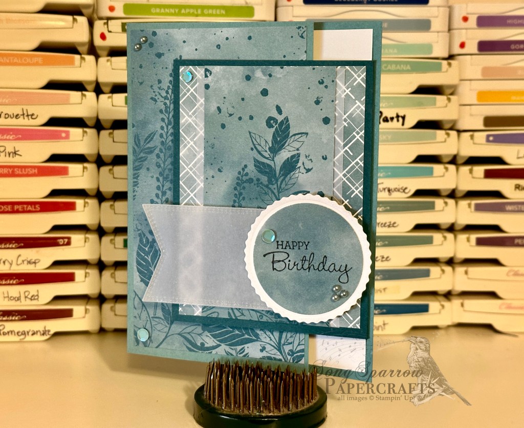Products used: Hello, Irresistible DSP Lost Lagoon, Pretty Peacock, Basic White, vellum cardstock Pansy Patch stamps Nested Essentials, All That dies Adhesive-backed pearls Adhesive-backed sequins Wink of Stella Dimensionals Adhesives