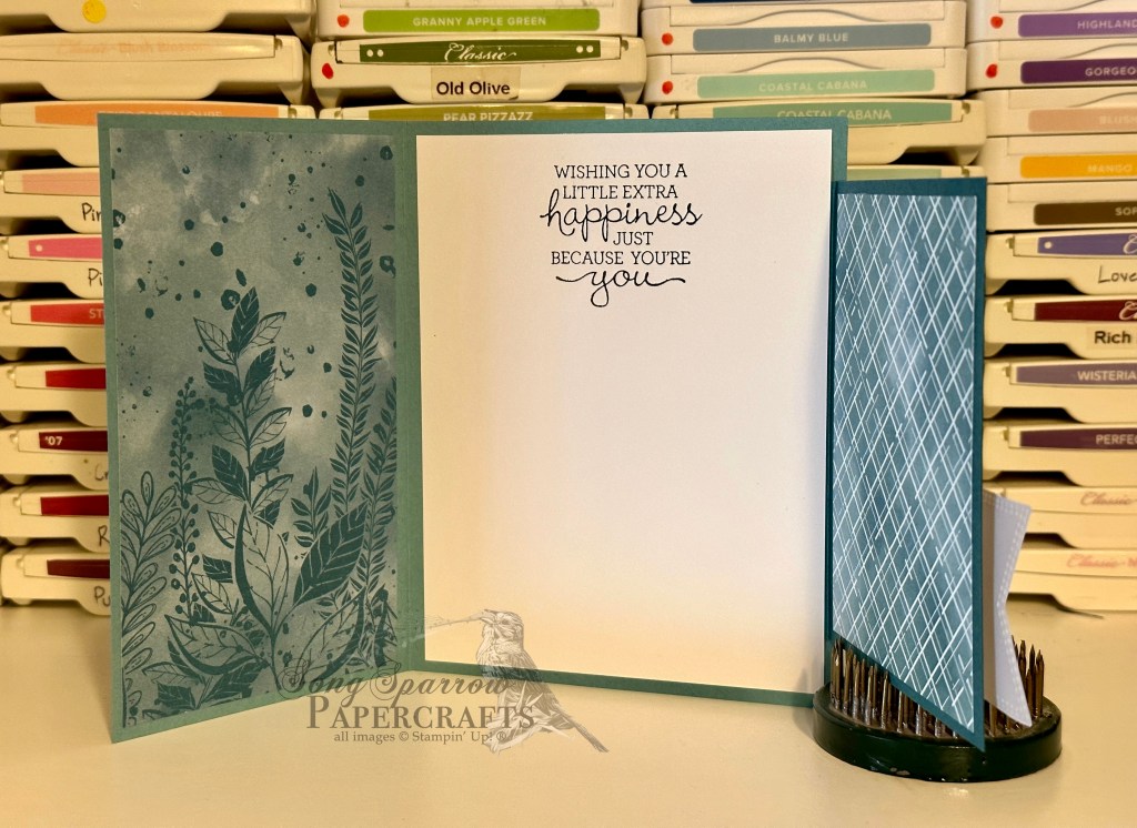 This fun fold reminds me of a barn door with the card opening in the center. Don’t you think? If you’re interested in how this design came together, go check it out over on Instagram!