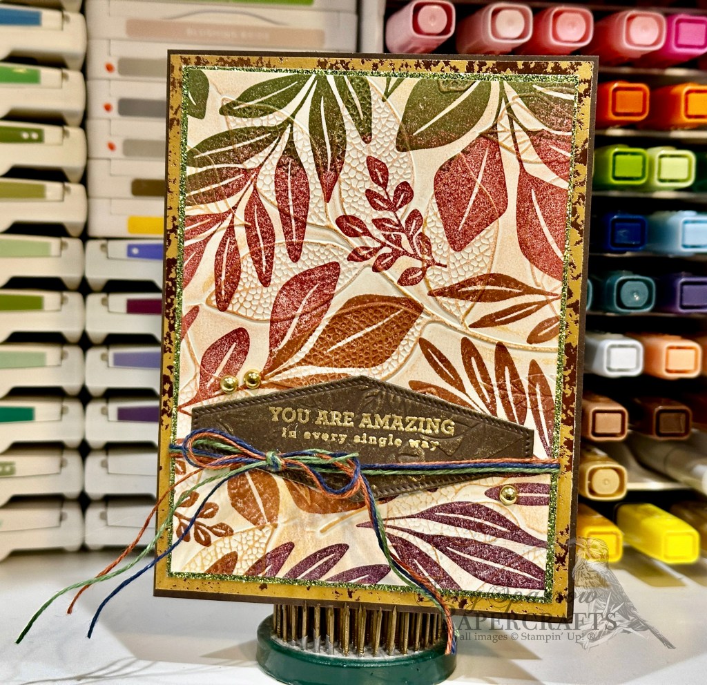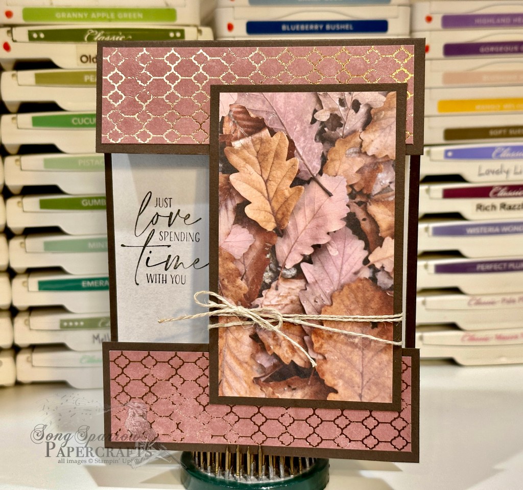 We get started with a base of Crumb Cake cardstock. This provides a nice neutral base that plays along with our nature-themed design. I used several different patterns from the Gathering Together patterned paper pack to create the backdrop for our focal images. The contrast from dark to light really let the beautiful tree and its foliage shine. The base image of our tree from the Autumn Tree set is stamped in Early Espresso on Copper Clay cardstock and then diecut with the coordinating die. (While this color is retired, you could just as easily substitute the Cajun Craze — it will simply be a bit brighter and I was going for a little more subdued.) The tree is adhered to the card front with glue dots. To really give some depth and realism to our beautiful fall foliage, I used the detailed leaves die from the die set and cut both Copper Clay and Oxidized Copper leaves and layered them a bit offset and affixed with dimensionals. I just love how the oxidized copper catches the light. The doe & fawn are the perfect addition to this serene scene. They’re cut from the woodgrain patterned sheet in the Gathering Together paper pack. The sentiment panel needed to be soft to allow our autumn scene to shine so I opted for some vellum. The sentiment from Gathering Moments is heat embossed in copper on the vellum and then diecut with the medium-sized banner in the Stylish Shapes set. It’s mounted over some Mossy Meadow & gold ribbon. And we finish things off with a touch of copper & gold in our Cajun Craze & Gold dots.