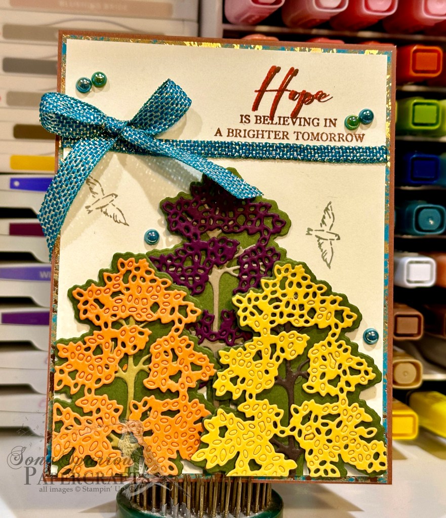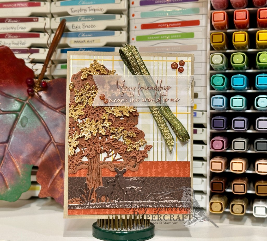 Well, this week, we’re turning back to autumn. I just got the new Autumn Trees bundle in a recent order, and I’ve been dying to get crafty with this awesome new set. The stamps and dies are so detailed and there are so many ways to really punch things up with this set. Today, the beautiful oak tree is taking center stage, along with our doe & fawn. Let’s see how this all comes together.
