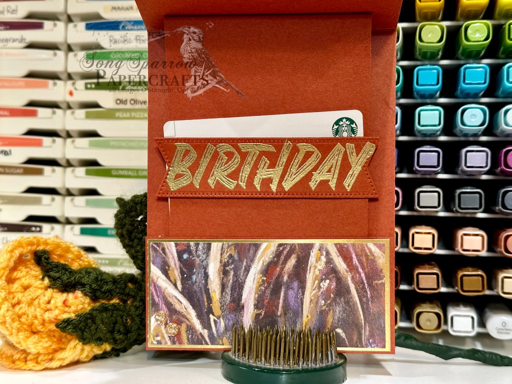 You might recognize this gift card layout and think that it looks familiar. And you would be exactly right! We’re flipping our new slider fun fold on its side to create today’s beautiful gift card design. I’m currently working on the tutorial and hope to have that up on the site later this week!