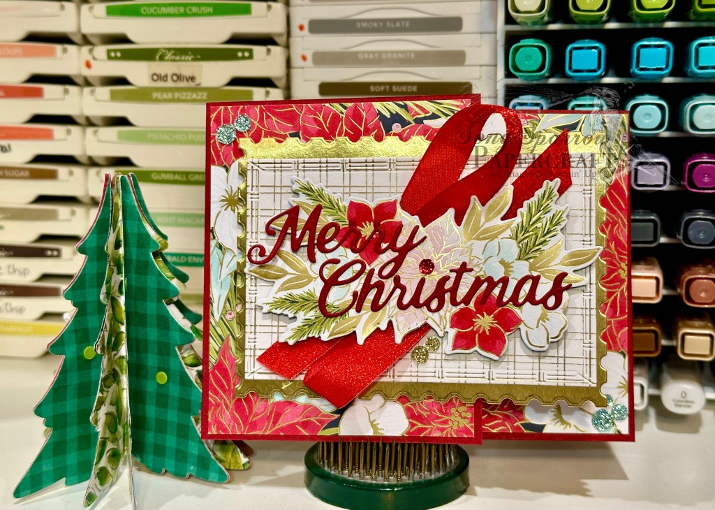 We get started with a base of Cherry Cobbler cardstock and score it to create the off-center barn fold look with the right panel serving as the pocket for our slider section. A sheet of the beautiful Traditions of Christmas paper serves as the backdrop for our card front. The overlapping focal panel backdrop is a combination of gold foil cut with the Perennial Postage dies and a sheet of the Regal Distressed Patterns paper cut with the Textured Notes dies. We use a combination of the Christmas Greenery dies and paper snips to cut the floral elements from another sheet of the Traditions of Christmas paper. The larger spray of florals is the focal image for the front panel, while the smaller fussy-cut elements serve as the cover for the slider pocket of the gift card panel. The front floral spray is adhered over a twist of the Real Red shiny ribbon using several layers of dimensionals. We finish everything off with a scattering of the Traditional Sparkling sequins across the front panel and add just a few on the gift card panel.