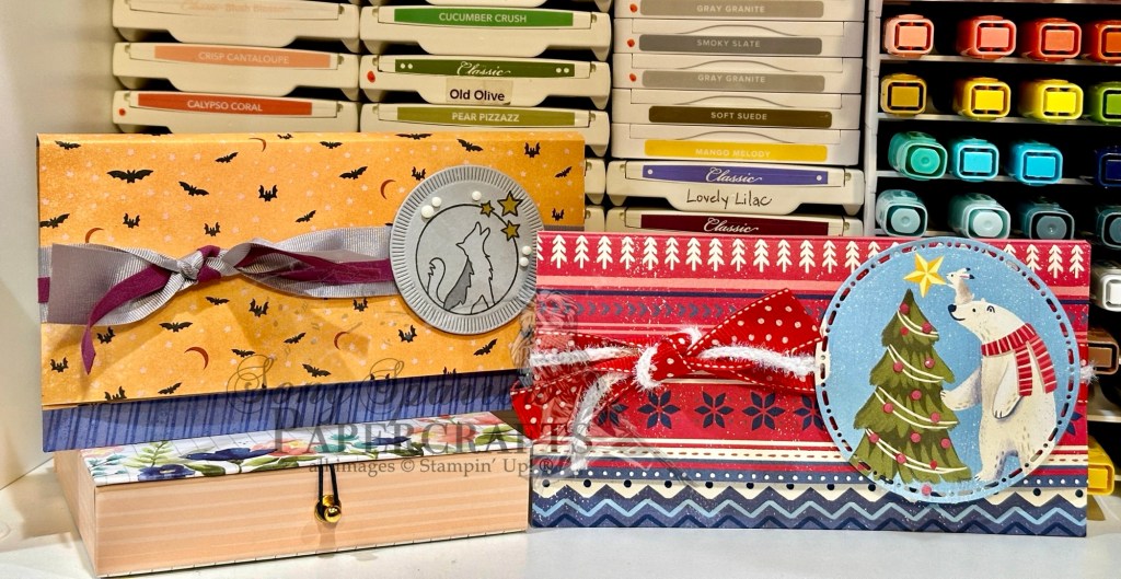 Products used in today’s featured designs: White cardstock Take a Bow, More Dazzle (retired), gold foil DSP Joyful ephemera Greetings of the Season, Nested Essentials, Changing Leaves dies Beary Christmas Memories & More (retired) Assorted twine (retired) Dimensionals Adhesives