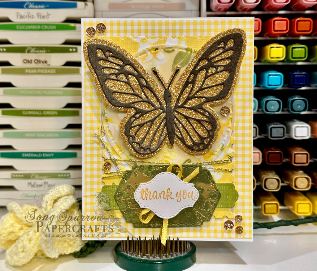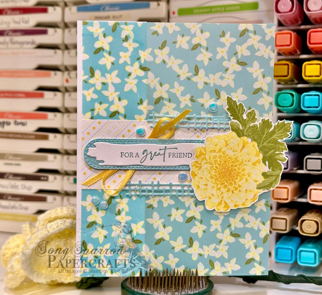 We get started by cutting a 6×6 backdrop from the yellow star-patterned Floral Delight paper. I wanted to break up the yellow background with something softer to serve as the backdrop for our focal images and decided on the white diagonal patterned paper from the Floral Delight paper pack and paired it with the blue gingham from the Floral & Gingham vellum pack. I used the Perennial Postage dies to cut the focal panel backdrop and the Spotlight on Nature dies to cut the vellum panel. I tied a combo of iridescent striped trim and Daffodil Delight satin ribbon around the base before adhering the diecut pieces with dimensionals. I stamped each of the larger floral bunches from the Mixed Florals stamp set on white cardstock and then diecut with the coordinating dies before coloring with my Stampin’ Blends. For a more realistic look, I always try to pull photos of flowers as the basis for how I color my images. I also diecut grass fronds from both of the greens in the Festive glimmer paper pack using the Mixed Florals dies and tucked these behind both floral bunches. I tied some gold trim around the flowers before adhering them to the focal panel with dimensionals. A scattering of the yellow shiny sequins adds another layer of subtle sparkle to finish things off.