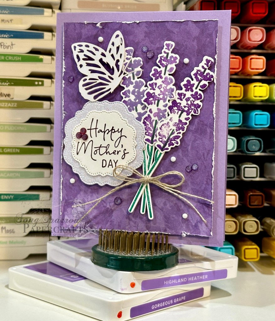 This lovely gets started with a base of Blackberry Bliss cardstock. The focal panel backdrop starts with a quarter panel of white cardstock that is machine embossed with the Dotted Circles embossing folder and is then matted with the Thoughtful Designs specialty paper. Our Thankful Garden bundle takes center stage here with the hydrangea bloom in the center. After stamping the image on white cardstock several times, I used the decorative masks to color the image. I chose to have the blooms be a combination of pink and purple — which was my grandmother’s favorite hues to aim for with her hydrangea (easier said than done). A layer of Wink of Stella over the blooms makes them shimmer in the light. The coordinating dies made quick work of cutting out the bloom and adding the life-like dimension. A combination of pink and purple regal dots serve as the floret centers. I cut some extra stems of leaves from a combination of the Lovely Garden patterned paper and a sheet of Shaded Spruce and laid the hydrangea bunch on top. The sentiment is created using a combination of Sweet Blooms dies and She’s the Greatest stamps. The lovely is cut from purple silver foil and Berry Burst glimmer paper. I adhered the two layers together with the glue pen before adhering over a bow of iridescent striped ribbon. I stamped Mom in Blackberry Bliss on white cardstock and used a heart punch to cut it out. It’s adhered with a dimensional. A few drusy embellishments finish things off with an extra sparkle.