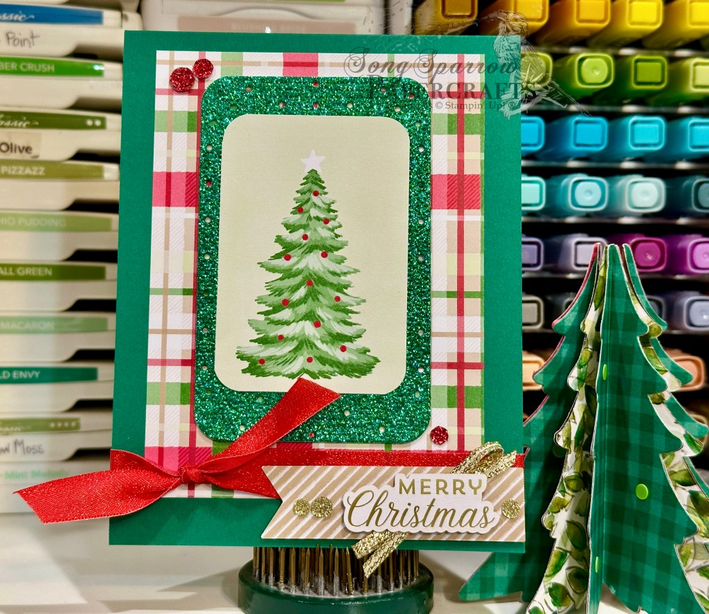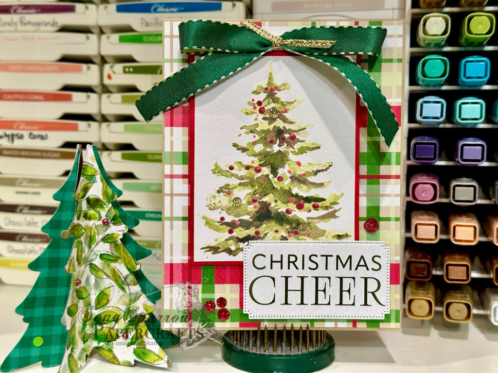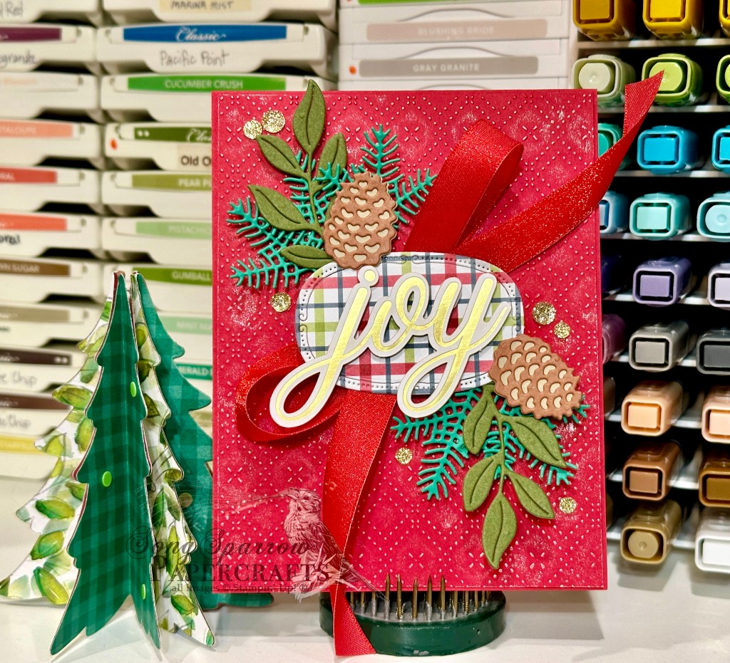I was inspired by a card I saw over at Stampin’ Fancy Friday, and I just ran with it from there. We get started with a base of Real Red cardstock. Our focal panel is a quarter sheet of red that is machine embossed with the Beautiful Pattern embossing folder. I went over the embossed panel lightly with some metallic ink to really make the embossing pop. You could easily use paper with a white core, but I like the sheen & sparkle from the metallic ink rub myself. Our sentiment panel takes center stage here with lots of detailed elements and pops of holiday color. The joy sentiment is from the Greetings for You ephemera pack and is mounted on a panel of Traditions of Christmas plaid paper diecut with one of the smaller Traditional Labels dies. We mount the sentiment panel with dimensionals on top of a bow of Real Red shiny ribbon, along with winter evergreens cut from Shaded Spruce and Mossy Meadow cardstock and pinecones cut from Crumb Cake and Pecan Pie cardstock using the Delicate Pines dies. We finish it all off with a scattering of gold glitter dots.