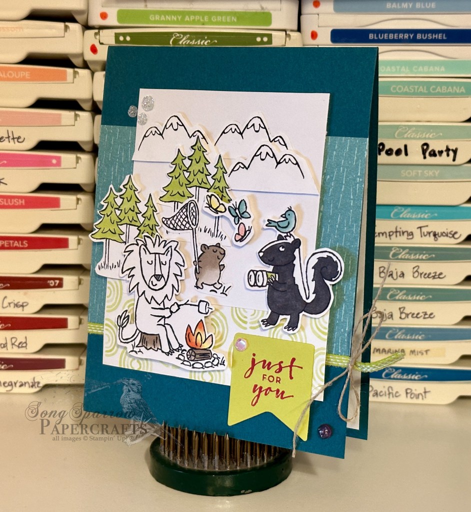 Today’s card has us gathering with friends around a campfire. We get started with a base of Pretty Peacock cardstock. The focal section of the card consists of a background of two patterns of designer series paper — Inked Botanicals and Bright & Beautiful — and a piece of white cardstock. Using the outdoor adventure sheet of the Zoo Crew designer series paper, I fussy cut several characters, as well as groups of trees and several mountain ranges, to build this scene. Dimensionals help give the scene depth. The sentiment from Charming Sentiments is stamped on Lemon Lime Twist and diecut with the Zany Zoo banner die. A strip of the ribbon duo tied off with linen thread, along with the bits of sparkle from the sequins, tinsel gems, and glitter sequins, finish things off by moving the eye across the design.