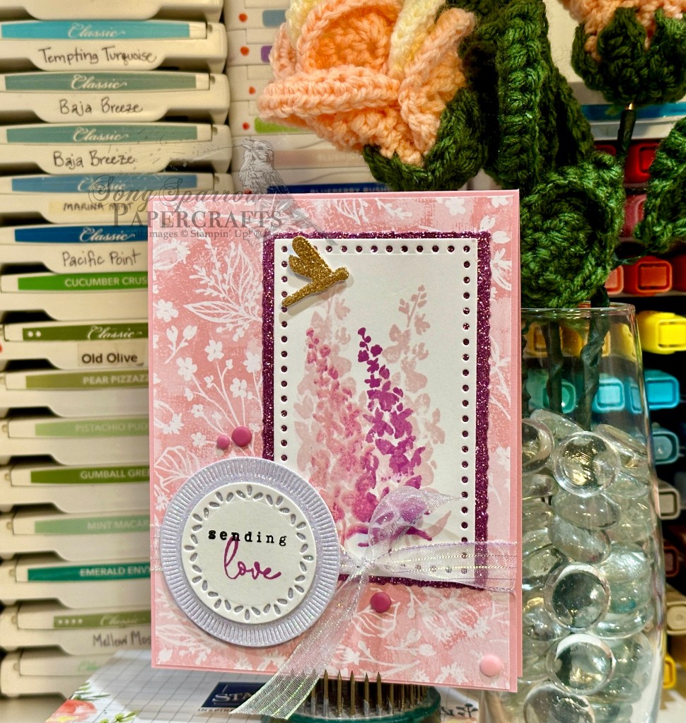 Next, I diecut the sentiment panel and mat. The sentiment panel mat is diecut from white glimmer paper and the sentiment panel itself is diecut from white cardstock using nesting circles from the Spotlight on Nature dies. The sentiment is from the Country Flowers set. I first stamped the word “sending” in black ink towards the top of the blank sentiment panel. Then I stamped “love” in Petunia Pop underneath, allowing part of the L to overlap the word “sending.” Adhere these two panels together with adhesive. TIP: To prevent stamping any portion of the word “sending” while stamping the remaining portion of your sentiment, I covered it with a piece of tape — any tape will do. I have tried cleaning my stamp in between stamping portions, but I still manage to get a ghost image of the previously inked portion. And I’ve found the taping method to be the most effective way to prevent that.