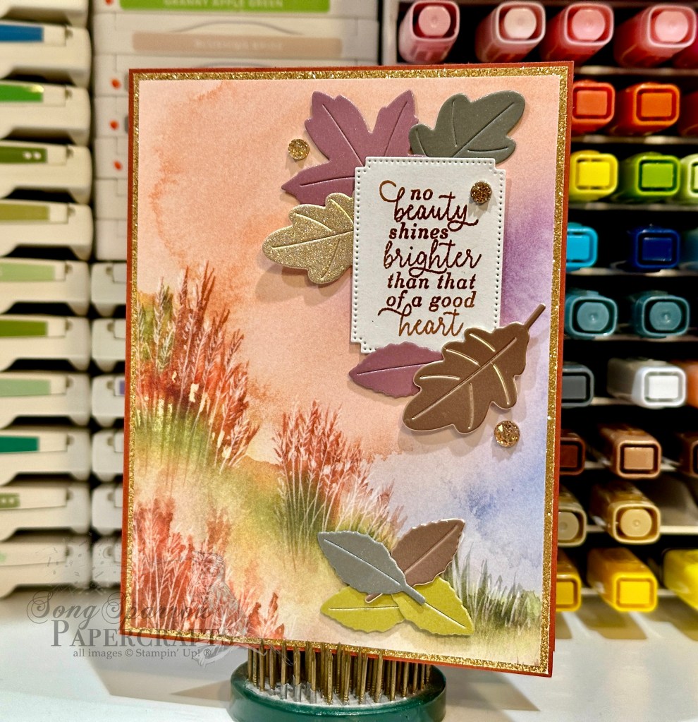 And that brings us to this week’s design theme — gratitude. We’re using our crafty goodies to create designs that allow us to express our thanks and gratitude. Today’s clean and simple design combines the Country Woods paper and some of the foliage dies, like Label Me Grateful and Gathering Moments, to create our door of gratitude.