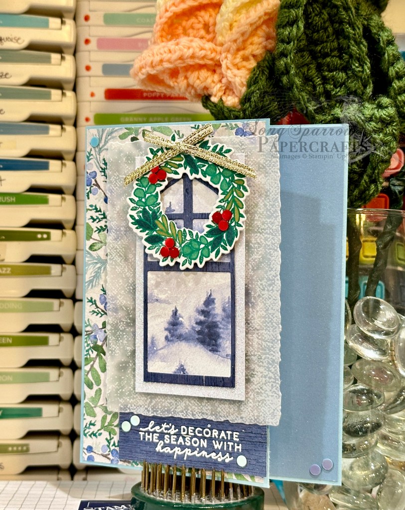 Products used in this card: Lost Lagoon, Pretty Peacock, Basic White cardstock Winter Meadow, Graceful Greenery vellum DSP Filled With Cheer stamps Merriest Trees, Spotlight on Nature dies Embossing powder Stampin’ Blends Wink of Stella Transparent dots Dimensionals Adhesives