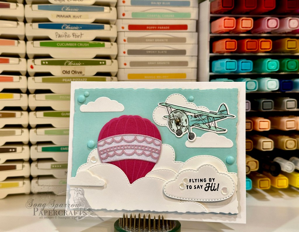 Our card gets started with a base is Balmy Blue cardstock. I chose a sunny day high in the clouds as the sky background here. The plane consists of two pieces cut with the Adventurous Sky dies — I used red festive glimmer paper and silver foil to give a more realistic metallic look to the plane’s exterior. I also cut propellers from silver foil and a disc of vellum with the Spotlight in Nature die to give the look of spinning propeller blades. An industrial trinket serves as the propeller hub in the center. I colored a few of the smaller iridescent faceted gems with my black Stampin’ Blend to serve as the hubcaps on the wheels. The plane is adhered to the sky background with dimensionals. I stamped the sentiment from the Adventurous Sky set in Balmy Blue in the upper left corner. I wanted the plane to look like it’s flying in between banks of clouds and so I cut another sheet of the background, going around just the clouds on the left. I adhered this layer with double dimensionals on top so that this cloud layer is on top. I added a few of the white sequins from the sequins trio pack as little glimmers in the clouds.