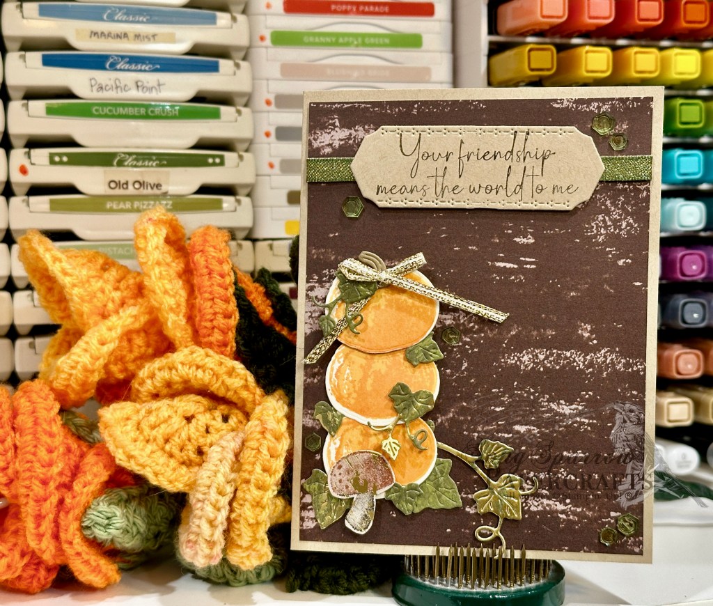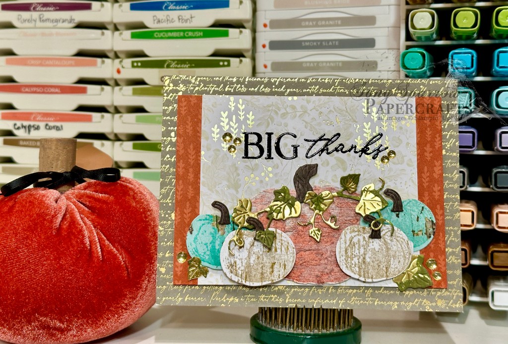 We get started with a neutral base of white cardstock. Our front panel backdrop is a sheet of the gold foiled script paper from the Nature’s Sweetness paper pack. The focal panel is a combination of two sheets of the Gathering Together paper – the Cajun Craze small leaf pattern and the gold foiled fall foliage pattern. It’s mounted to the card front with dimensionals. The sentiment from the *new* 12 Days of Crafting Advent Calendar stamp set is heat embossed in black at the top of the panel. I wanted the pumpkins to have more texture and interest than what the stamps alone would provide, so I selected several of the woodgrain patterns from the Country Woods paper pack and used the detail stamp from the Beautiful Pumpkins set and a coordinating, but light, color on top of each woodgrain and then used the coordinating dies to cut out each one. The pumpkin stems are also cut from one of the darker woodgrain patterns from the Country Woods paper pack. I tried several different colors for the leaves and vines before settling on the Old Olive sheet from the Season of Elegance paper pack. We give the pumpkins lots of depth of field by adhering them with varying heights of dimensionals. And we finish things off with some gold low profile dots.