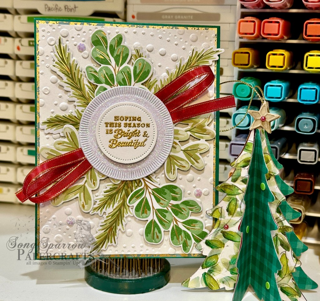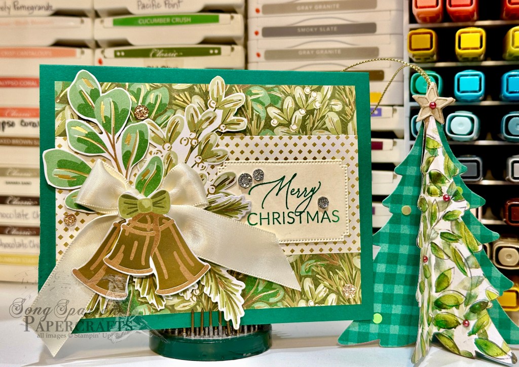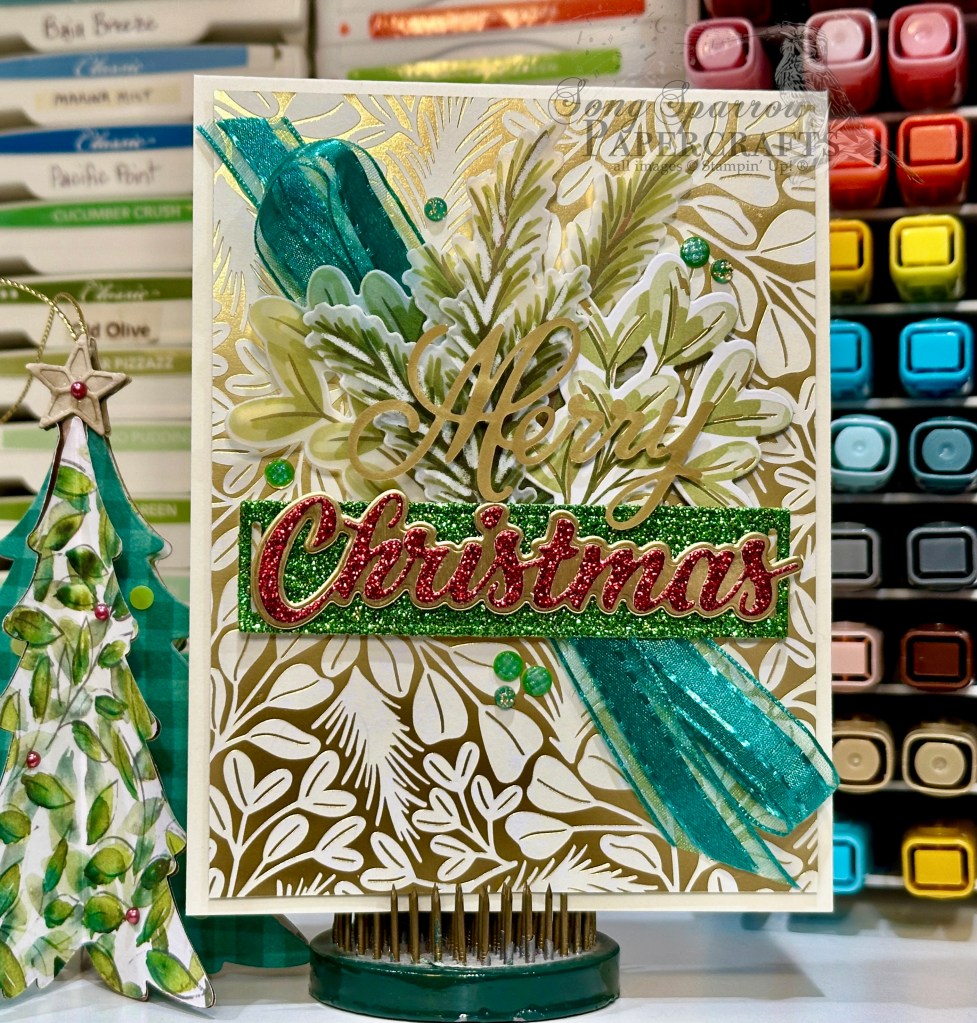 Today, I’m using a combination of evergreen colors with the glittering gold elements of the suite to create this elegant holiday design.
