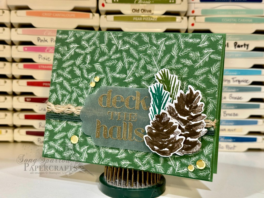 Have you seen the One Horse Open Sleigh designer series paper that is currently available in the Online Exclusives section of my online store? Every single sheet of paper in this 6×6 pack is gorgeous! It makes them so hard to cut and use! So I’m designing cards that use as much of each sheet in one card design as possible.