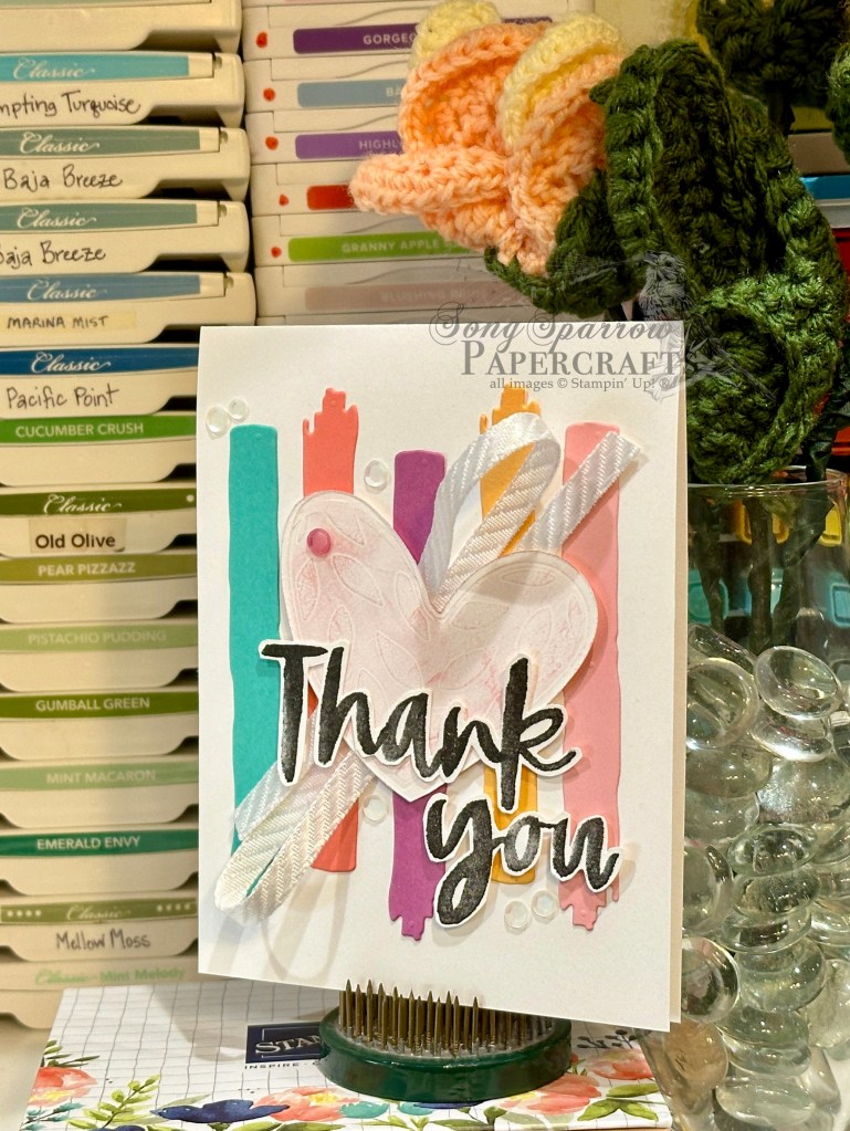 We get started with a card base of Basic White cardstock. While a standard sized card, the cardstock is cut down the long edge rather than the short edge, giving you a score at the top. The paint smudge die gives us our background and is a combination of Summer Splash, Calypso Coral, Petunia Pop, Peach Pie, and Pretty in Pink cardstock. Each smudge is oriented a different direction and is slightly offset for some visual interest. The sentiment backdrop is white cardstock that has been debossed with the leaf-print die, cut out with the open heart die, and then lightly smudged with Pretty in Pink ink to really bring out the debossed pattern. A twist of the white diagonal trim is adhered behind the heart, which is placed over the backdrop with dimensionals. The sentiment from Simply Said is stamped in black on white cardstock and then fussy cut with paper snips before being adhered with dimensionals. The design is finished with the white and pink sequins from the Sequins Trio set.