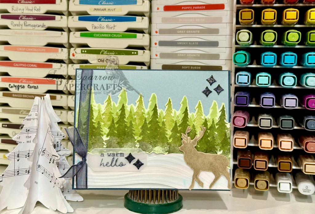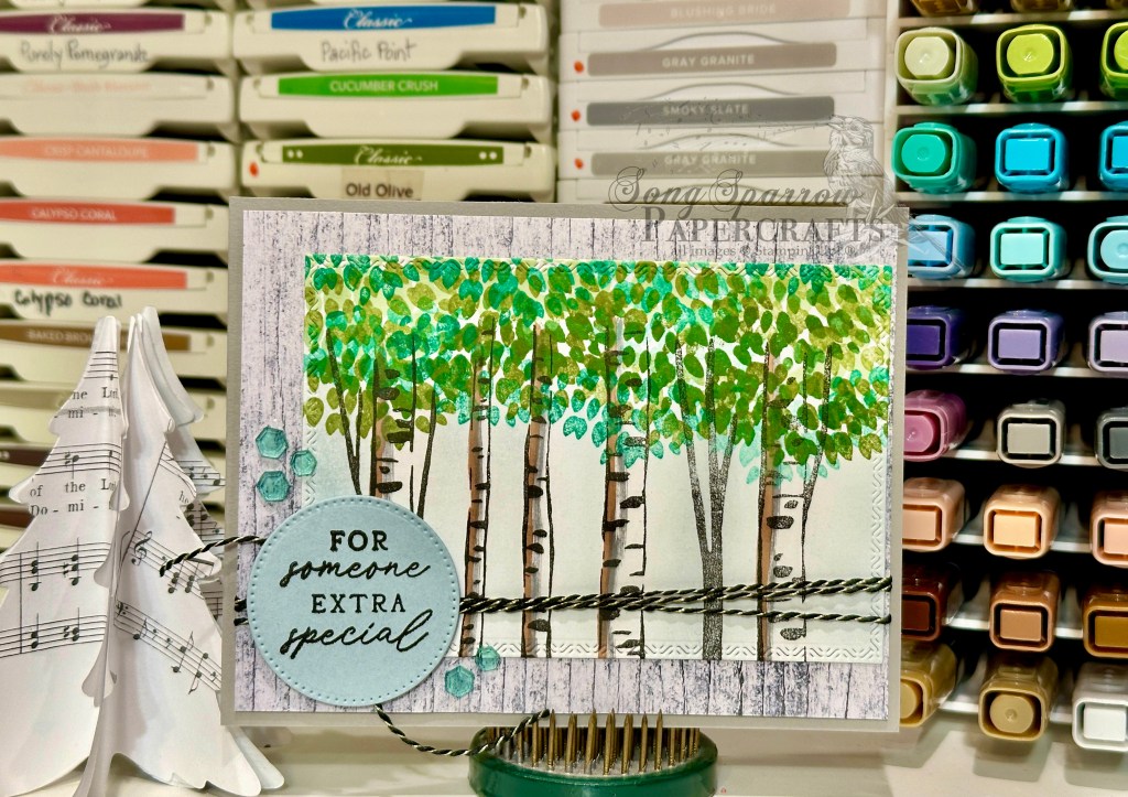 We get started with a base of Smoky Slate cardstock. A sheet of the grey woodgrain from the Country Woods paper pack serves as our focal backdrop. I arranged the Aspen Grove stamps on a large block and stamped the row of trunks in black ink onto white cardstock. I layered several shades of green leaves up top to create the treetop canopy. To give some realistic depth to the tree trunks, we use Crumb Cake and Smoky Slate Stampin’ Blends down the left side of each one, which gives a shadow effect. I filled in a touch of blue in the background with Cloud Cover ink, but you could easily skip this shading (and next time, I think I will!). The focal panel is downsized using the Textured Notes die and then adhered to the woodgrain backdrop. The full panel is wrapped in black & gold bakers twine that is tied in a knot on the left side before the focal panel is adhered to the card front with dimensionals. The sentiment panel is cut from Cloud Cover cardstock with the Stylish Shapes circle die and then the sentiment from the 12 Days of Christmas Advent calendar is stamped in black in the center and then adhered over the twine with dimensionals. I added a few of the lighter Shades of Green Hexagons on either side of the sentiment to draw the eye in and add a bit of colorful eye candy.