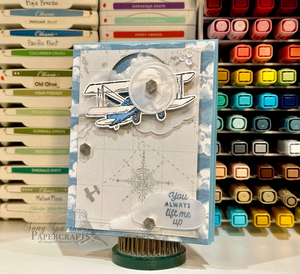 This card design is built on a base of Basic White cardstock. The focal panel base is sheet of lattice pattern from the Flowering Zinnias designer paper pack that is matted with Basic Black cardstock. The focal panel itself consists of the background circle panel cut from the white woodgrain sheet from the Country Woods designer paper pack using the middle circle size of the Spotlight on Nature dies and adhered using dimensionals. Our focal image is the largest image in the Simply Zinnia stamp set stamped on white cardstock and then diecut using the coordinating Simply Zinnia die. I used Stampin’ Blends to color the stems and zinnia centers, leaving the flowers themselves white. I originally intended to color the flowers but loved the look of the white flowers against the busy background of this design. The (partial) sentiment from Wonderful Thoughts is stamped on white cardstock and then diecut using the Happy Little Things banner die. A bit of silver and white trim behind the sentiment panel adds a little sparkle and works together with the transparent dots to draw the eye across the design to the sentiment.