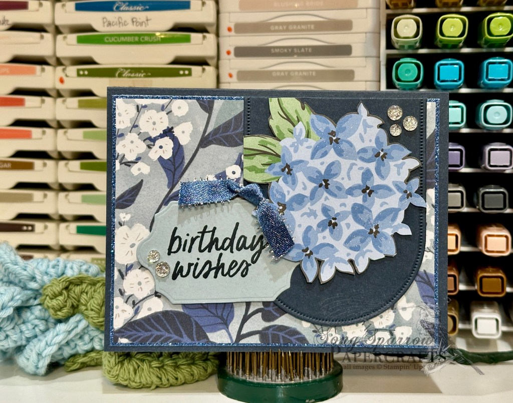 We get started with a base of Secret Sea cardstock. The background panel is a floral sheet of the Peaceful Garden patterned paper that is matted with a sheet of Misty Moonlight glimmer paper from the coordinating glimmer pack. Our focal panel is a trio of elements starting with an arched backdrop cut from Secret Sea using the Everyday Arches dies. I fussy cut the hydrangea bloom from a sheet of the Lovely Garden patterned paper and affixed it to the arch panel using dimensionals. The sentiment from Simply Said is stamped in Secret Sea on Cloud Cover cardstock and then cut with the smallest Peace on Earth dies using the reverse-extension method, making it smaller than the standard die size. It’s tucked under the hydrangea bunch. The full panel is adhered to the card front with dimensionals. We add a knot of Misty Moonlight & silver edged ribbon over the sentiment, some Wink of Stella to the hydrangea blooms, and two bunches of silver Drusy embellishments opposite one another on the focal panel.