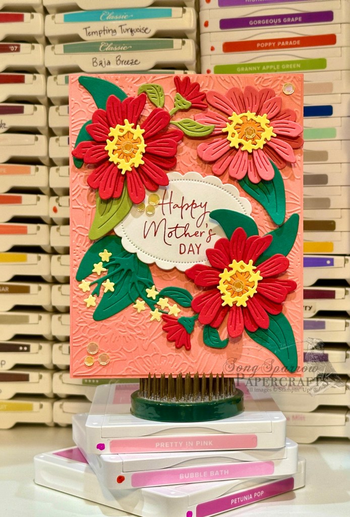 We’re rounding out our walk through the garden this week with a trip to the country. Today’s card design features the Country Flowers set by Stampin’ Up!, which is currently on the Last Chance list, and a card layout I spotted in a recent post shared over at Stampin’ Through the Catalog. I adapted the layout and color palette to fit the products I wanted to use.