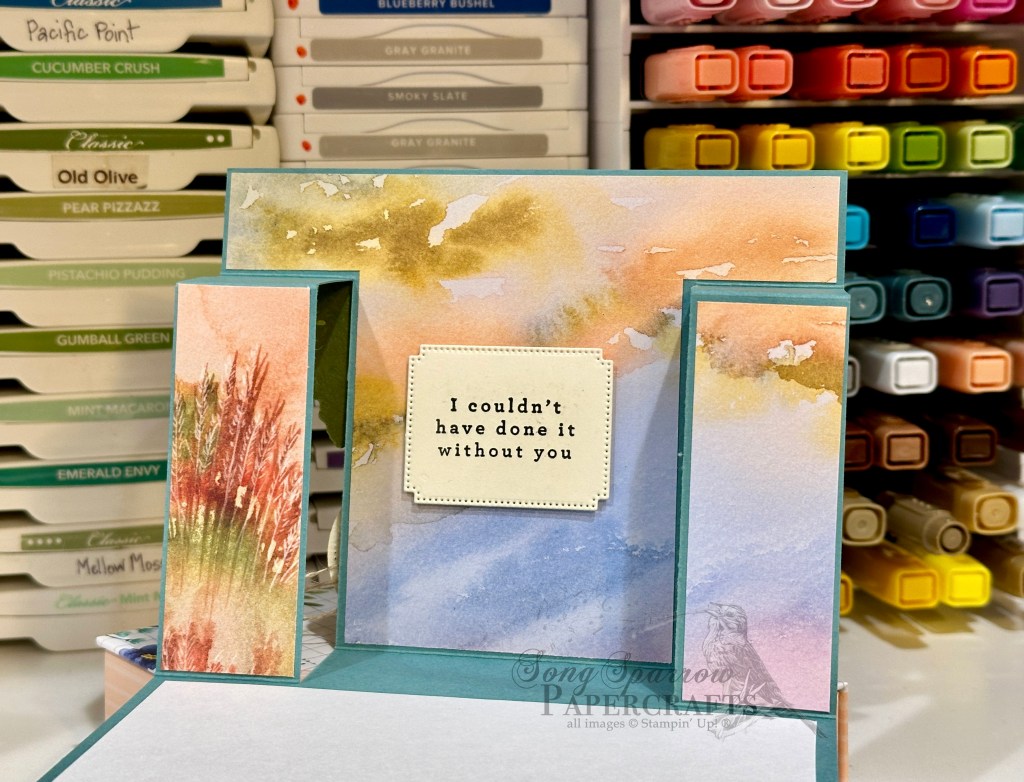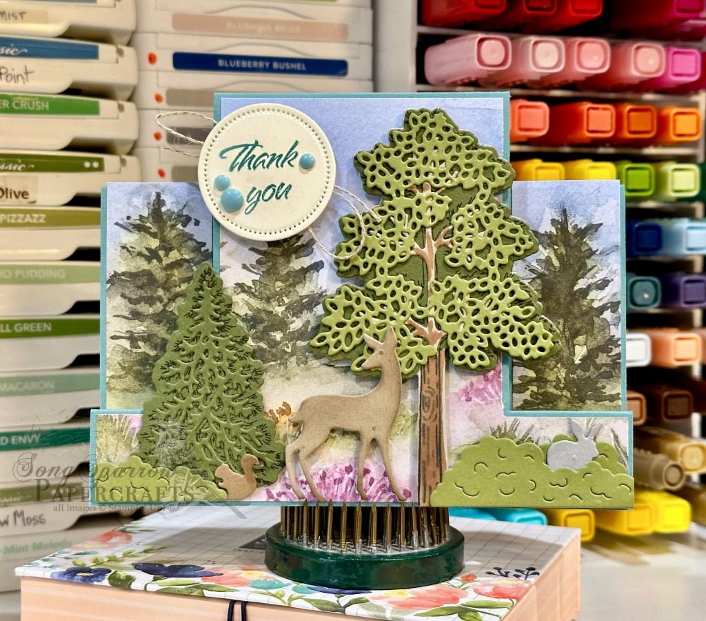 We get started with a base of Copper Clay cardstock. Our focal panel consists of a background of Very Vanilla and a mat of Oxidized Copper. We build our forest of trees using the Frosted Forest dies. The base color is Mossy Meadow and then the changing foliage is a combination of Blackberry Bliss, Daffodil Delight, and Pumpkin Pie. The trees are adhered on varying levels of dimensionals to give some dimension to the scene and realism to the depth of forest. A few birds stamped using the Frosted Forest stamps add another layer of realism to our forest scene. The sentiment from Unbounded Love is stamped on the vanilla backdrop. The strip of Pretty Peacock & Gold metallic ribbon add some sparkle and help draw the eye to the top and the sentiment. A few Blooming Pearls help finish things off.