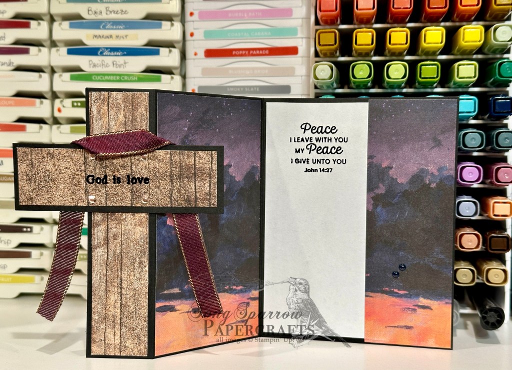 Then we start working on our focal Z-panel, which is a little smaller. I sized the Cloud Cover base so that none of the small cards from the Days Like This card pack had to be cut down. I wanted to preserve all of the pretty details of each of the patterns selected — the front sentiment panel, middle pattern, and inside butterflies. Caveat: this does impact how much you’re able to open the card — it will not lie flat when open. (Side note: I need to work on some kind of sliding mechanism for the next one I make like this.) To preserve all of the pretty card details means that our message panel — a blank card with tiny butterfly detail on the bottom — is a hidden, pull-out element. I used a piece of the Secret Sea bordered ribbon and stabled it in place to serve as the pull-out tab for the message panel. Some Wink of Stella on the smaller butterflies in each of the panels adds some twinkly interest, along with the Cloud Cover baker’s twine from the 2025 Advent Calendar and a few iridescent foil gems.